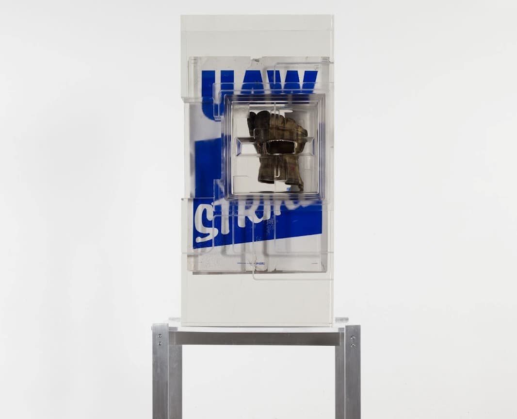 In earlier iterations of his “Dark Silhouette” series, Harrison explored foundational aspects of race, identity, and humanity with work that showcased West African sculptures and animal skeletal remains. With these latest additions, exhibited in conversation with his older work, he narrows his focus to his home base in Detroit, and draws on his experience as a clay modeler at Ford Motor Company to examine the role of the prototype in society, particularly at a time when the assembly line is undergoing a robotic revolution. Union signs, auto parts, hard hats, and other rust belt relics, all trapped in resin, remind us of the traditions that have long defined labor in the United States—rightly or wrongly—and beg the question: If the future is ours to build, what should we take with us?