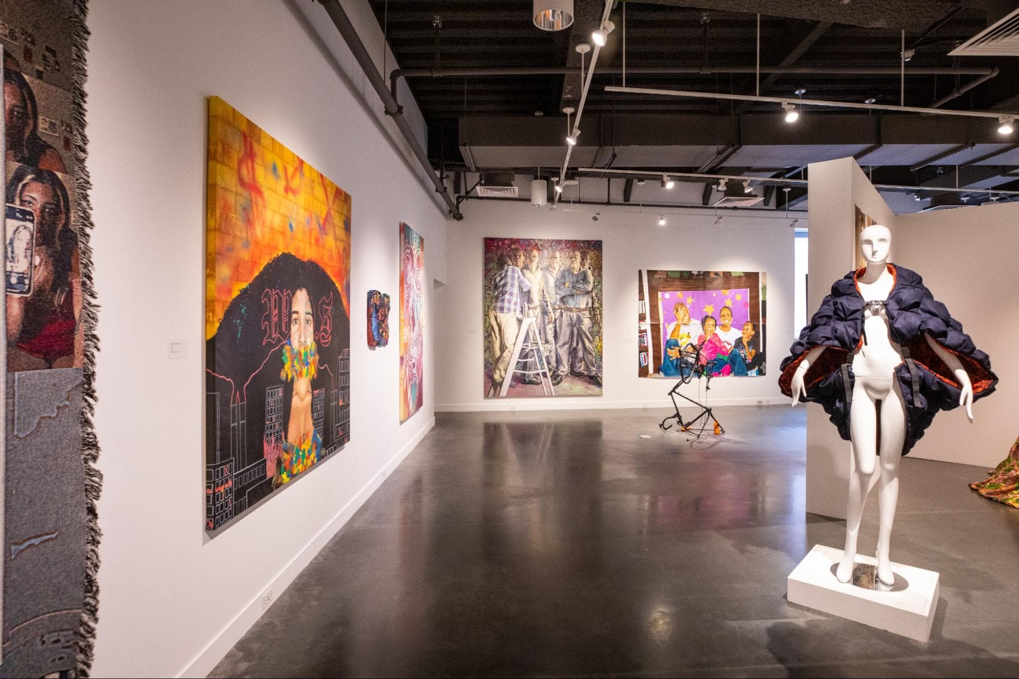 Rethinking inclusion and community, student co-curators Rey Londres (RISD) and Melaine Ferdinand-King (Brown University) organized “New Beginnings” to create meaningful space for Black artists and designers in Providence. Viewers enter a purposefully white-walled gallery to see a striking range of vibrant artwork from eighty artists filling the space. The scope of work reflects the curators’ desire to present a wide array of mediums and experiences, including works on paper, photographs, paintings, sculptures, video, textiles, and apparel ranging from the 1970’s to 2022, and participating artists—whether they be students, staff, alumni, or from the broader local community—aged 17 to 70. The inaugural “Black Biennial” opens the door for continued collective conversation with Black creatives in the Providence area while setting a high bar for student-led initiatives that reach beyond their university walls.