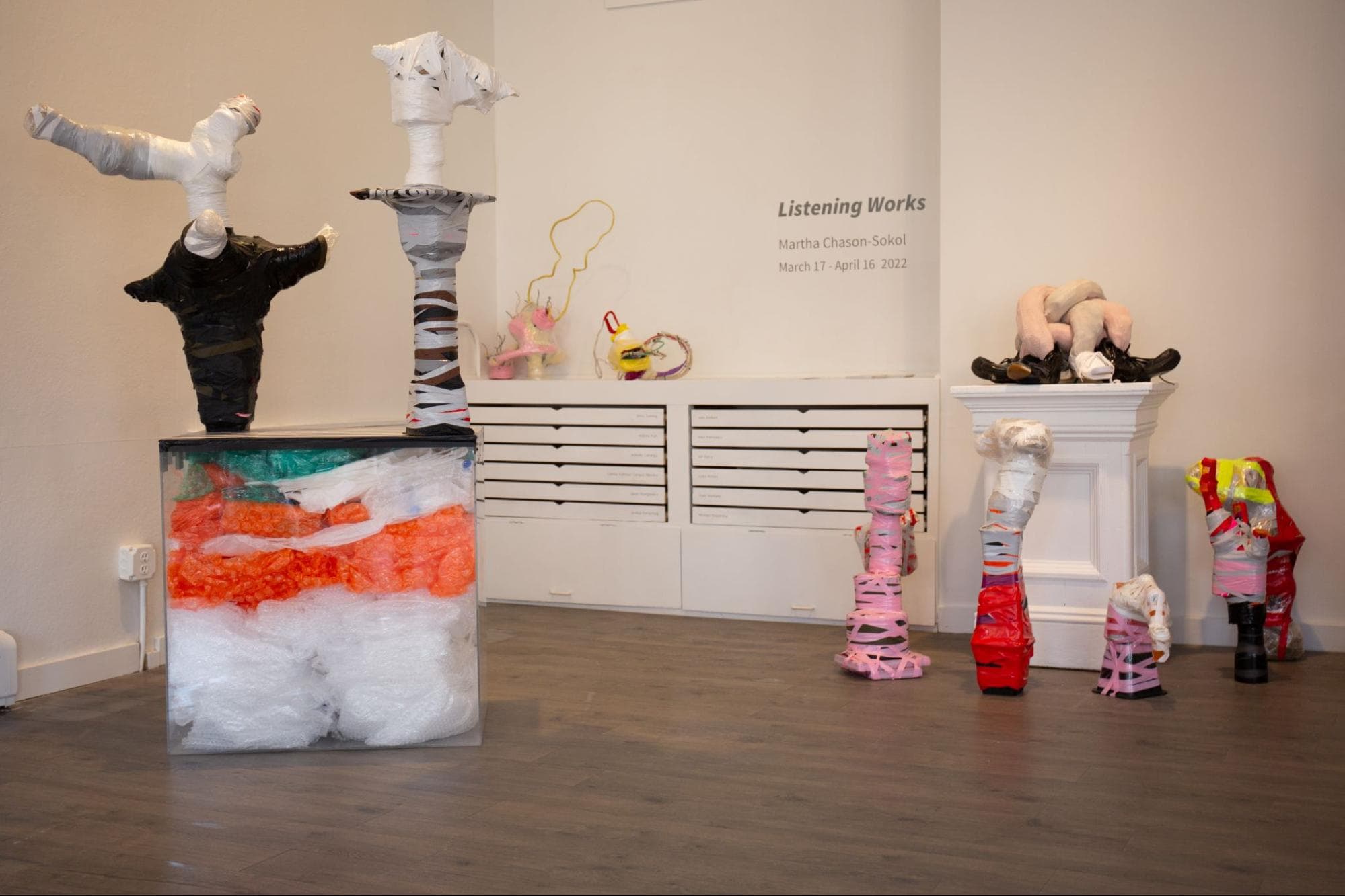 Tucked on the corner of a quiet residential street in Cambridgeport, Gallery 263’s solid lineup of exhibitions are seldom in the limelight. Currently on view, “Listening Works,” is the Everett-based artist Martha Chason-Sokol’s first-ever solo exhibition in Massachusetts. Chason-Sokol’s sculptures transform found objects (takeout containers, tequila bottles, plumbing supplies, and shaving cream canisters among the many) into flamboyant characters, wrapped by tapes and plastics in vibrant hues of orange, bright red, turquoise, and baby pink. Chason-Sokol describes each of these sculpture-characters as an “archive,” a collection of debris vibrating with its own unique histories and multiple, recycled lives. The work first emerges from a drawing process informed by the artist’s inner dialogue, ultimately fusing the personal with the universality of circulating matter. Viewers can meet the cast of sculpture-characters through April 16, or experience the virtual exhibition here.