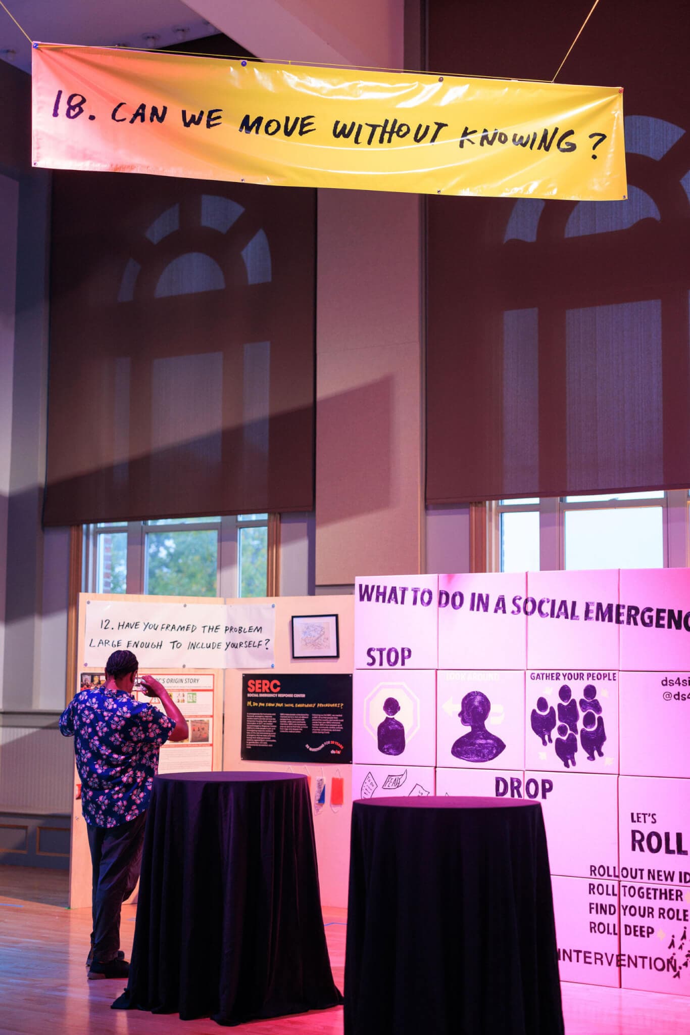 LL: I don’t know if the questions shape the event, but they weave in and out of the event. The questions themselves are an intervention. We try to actually put them up around the city as an intervention, as a provocation, as a way to invite people into some of the questions, like “What is a citizen forbidden from feeling?” or “What is hidden in public?” or “How do we reimagine imagination?” They are questions that we wanted to share in public space with passersby. So folks might look for the questions or they just might stumble upon a question. And then there are questions that we were really using to highlight some of our work, like “Have you framed the problem large enough to include yourself?” which was really part of how we were thinking about our Social Emergency Response Center. But there are a lot of ways that we let the questions weave throughout the space. Like there are questions on the windows that you might look out and see—like “What’s happened to us spatially?”—while you’re looking out at the city. So they’re not really like the format per se; they operate sort of as a subtext.