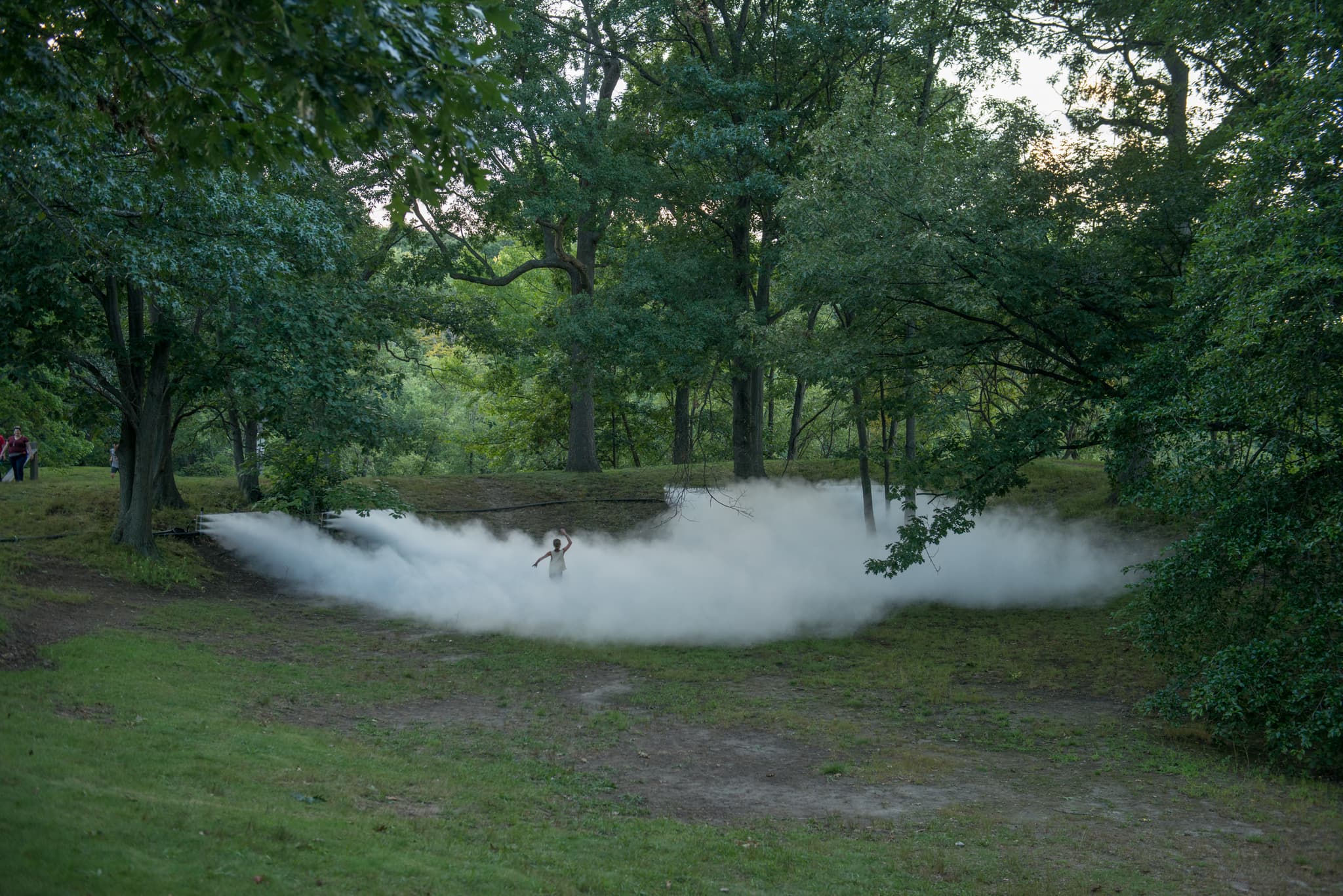 Fujiko Nakaya, with Jen Mergel, testing her fog sculpture Fog x Ruins in Franklin Park, Boston, 2018. Image by Melissa Ostrow. Courtesy of the Emerald Necklace Conservancy.