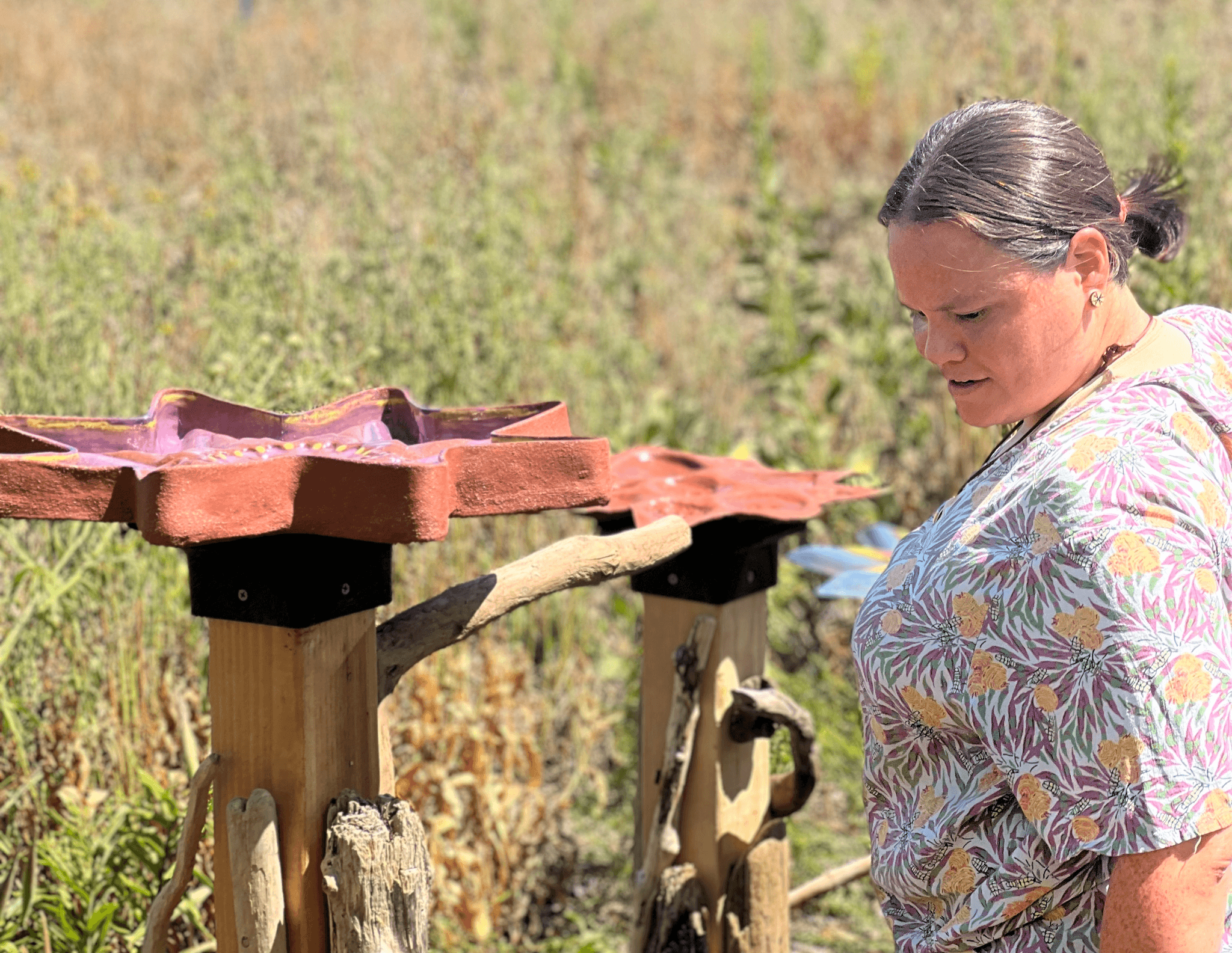 Erin Genia with her installation Tuȟmaǧatip (2022). Clay, natural composite materials, driftwood, gourd, bamboo, pipestone pigment. Courtesy of the Rose Kennedy Greenway. Photo by Audrey Lopez.
