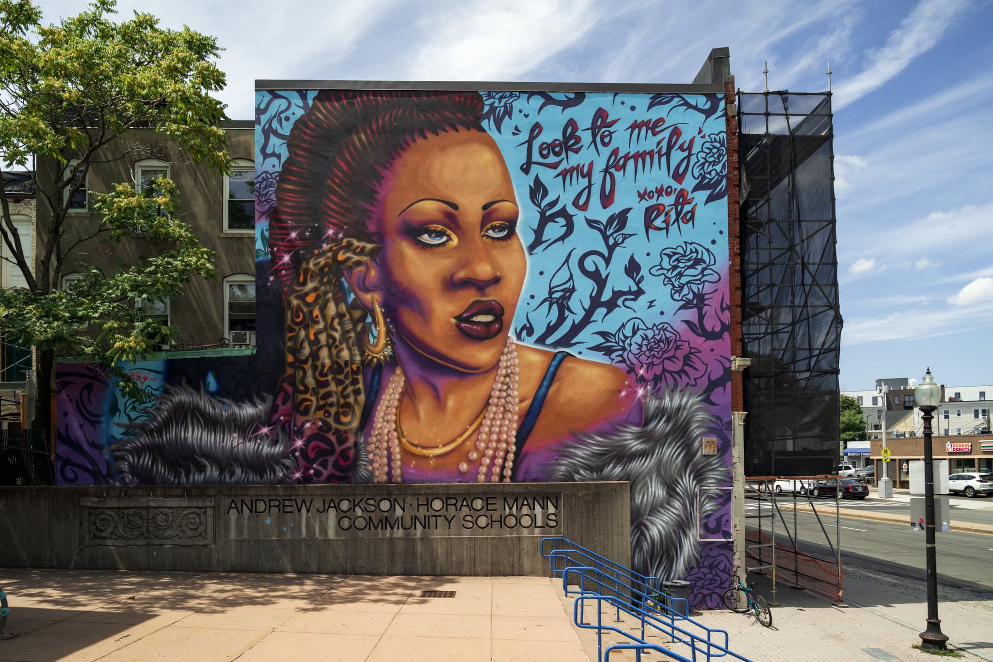 In Allston, artist Rixy was commissioned to create a mural that honors the life of Rita Hester, a Black trans woman who was a beloved community member in Allston. Her death was the result of anti-trans violence in 1998, and in November of 1999, activists organized the first Transgender Day of Remembrance in Hester’s honor. The mural was first proposed by Boston Artist in Residence Golden, who suggested a mural to honor the legacy of Rita Hester in the neighborhood she loved. Rixy’s response to the call was designed based on conversations with members of Hester’s family, community groups, and local trans advocacy organizations. The resulting portrait, titled Rita’s Spotlight, features Hester with glowing pearls adorning her neck, a feather boa around her shoulders, and—in Rixy’s classic feline touch—hands rendered in cheetah print. Recently unveiled at 506 Cambridge Street in Allston, the mural features a line from one of Hester’s poems that reads “Look to me my family” and calls onlookers into her light.