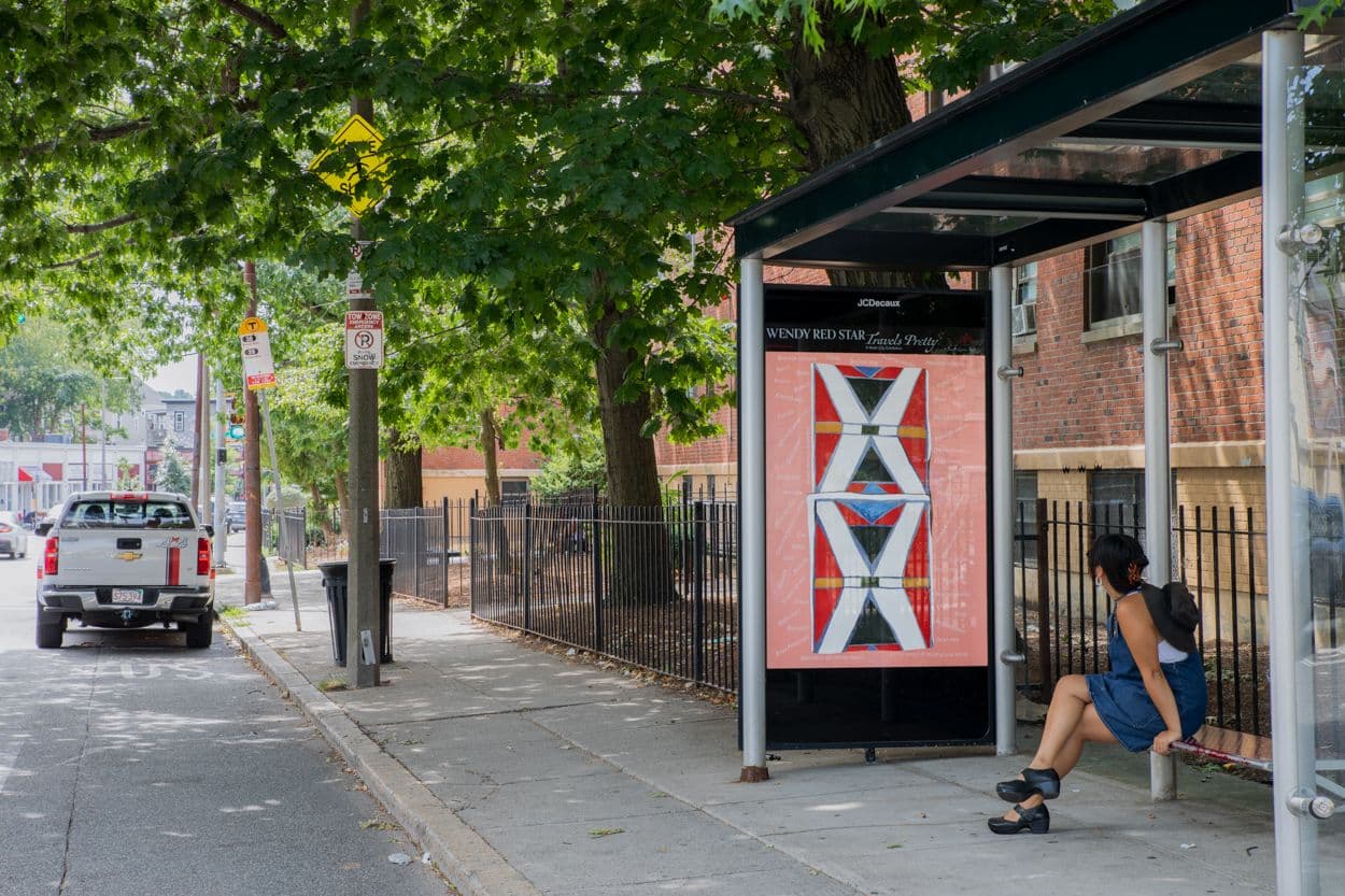 Wendy Red Star, Brings Together, 2022. Acrylic, digital print. Courtesy of the artist. Artwork part of “Wendy Red Star: Travels Pretty,” presented in Boston by Public Art Fund on 300 JCDecaux bus shelters across New York City, Boston, and Chicago, on view August 10–November 20, 2022. Photo: Mel Taing, Courtesy of Public Art Fund, NY.