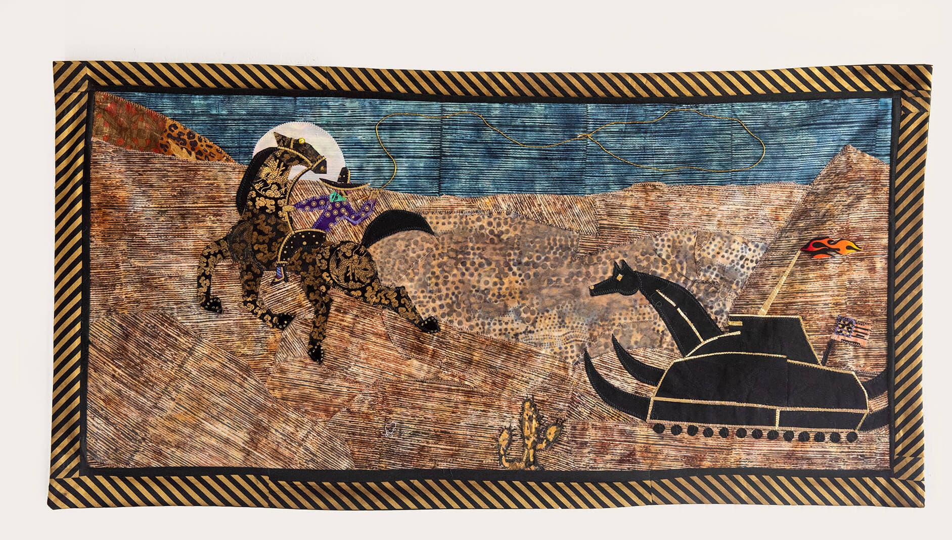 Clara Wainwright, The Failed Lasso of the Trojan Rocker, 2024. Fabric collage, acrylic & marker. 46 ½  x 23 ½ inches. Photo by Richard Howard. Courtesy of Paul Deitrich Gallery.