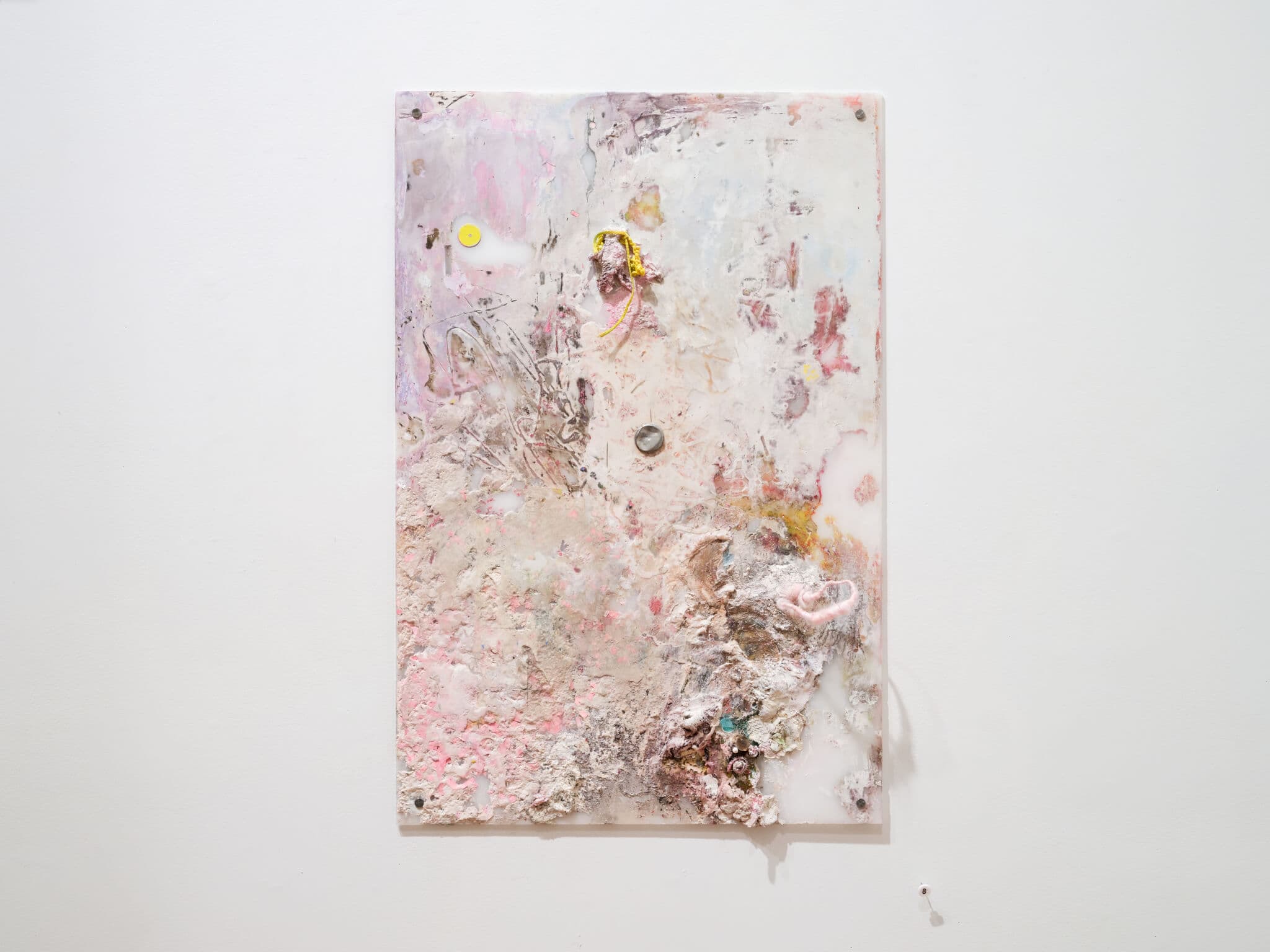 Nahom Ghebredngl’s Salt Flats (I spilled it all) (2026) and Steamer (A Junkyard Floats on a Yellow Line) (2025) hang in the far corner of the space. From afar, these relatively small works might recall Rothko, Twombly: modulated fields of soft color interrupted by energetic flourishes. What initially masquerade as paintings reveal themselves to be carefully constructed sculptures. Plaster and papier-mâché pigmented with coffee, crayon, and chalk are studded with hair, used chewing gum, and crushed cans. Ghebredngl transforms materials which would otherwise get swept up or vacuumed away into delicately layered archeological works embedded with detritus of life. We’re drawn into these assemblages by recognizing that which we intimately and regularly encounter in our lives. At moments, their warm, delicately textured surfaces begin to evoke skin. By reveling in that which is cast off, Ghebredngl resists the lure of the pristine, monumentalizes wasted landscapes, and underscores our connection to them.