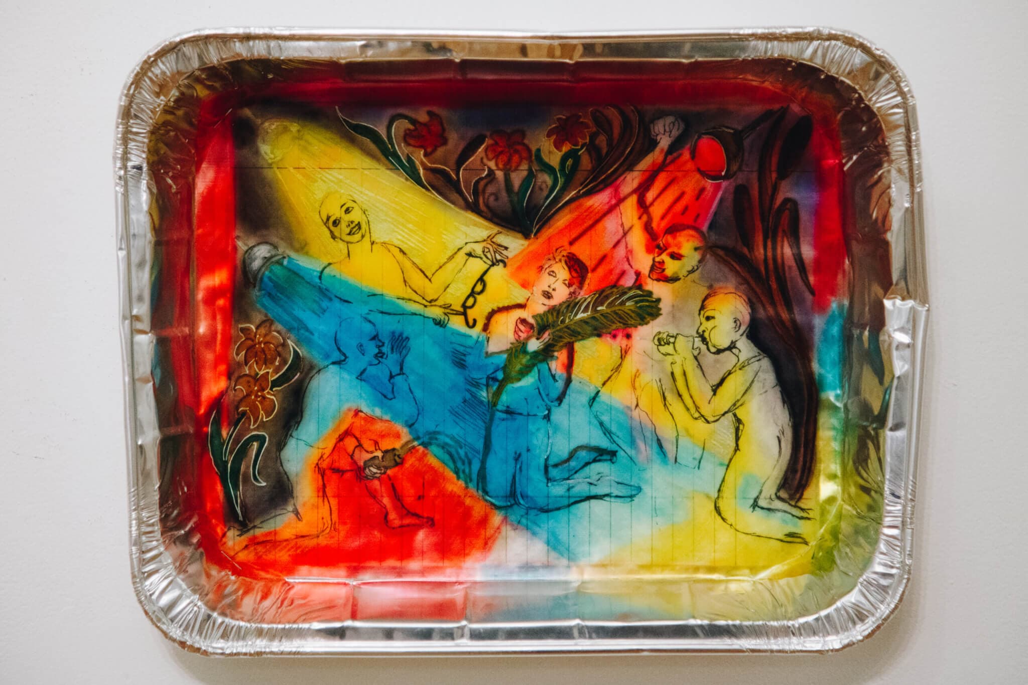 Thomas Lanigan-Schmidt, detail from Mysterium Tremendum, late 1980s. Mixed media on aluminum lasagna tray. 13 𝗑 10½ 𝗑 2 in. Photo by yoon. Courtesy of the artist and Pavel Zoubok Fine Art, NY.