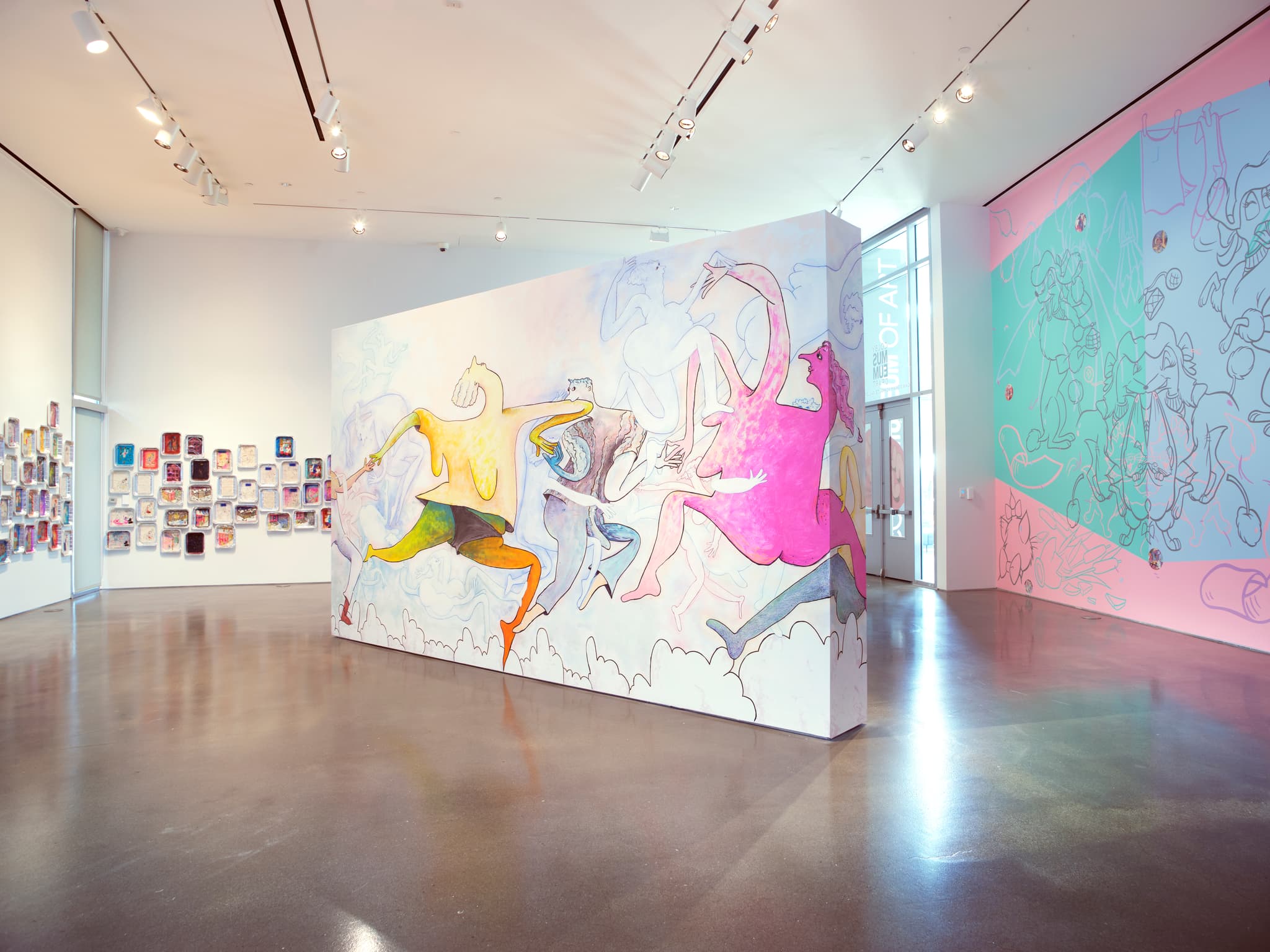 Nilsson’s painting was the result of two weeks of on-site work by the artist. According to the exhibition’s curator, Kendall DeBoer, Nilsson looked to tools from the museum’s many children’s programs in the downtown venue—sidewalk chalk, washable markers, glitter pens—as materials for envisioning how her characteristically playful, layered compositions would take shape. The commission, DeBoer stressed, is temporary; the monumental work will be painted over upon the exhibition’s conclusion in mid-November. This predetermined lifetime likely instigated a certain freedom for Nilsson, who used unfixed matter like chalk and charcoal.