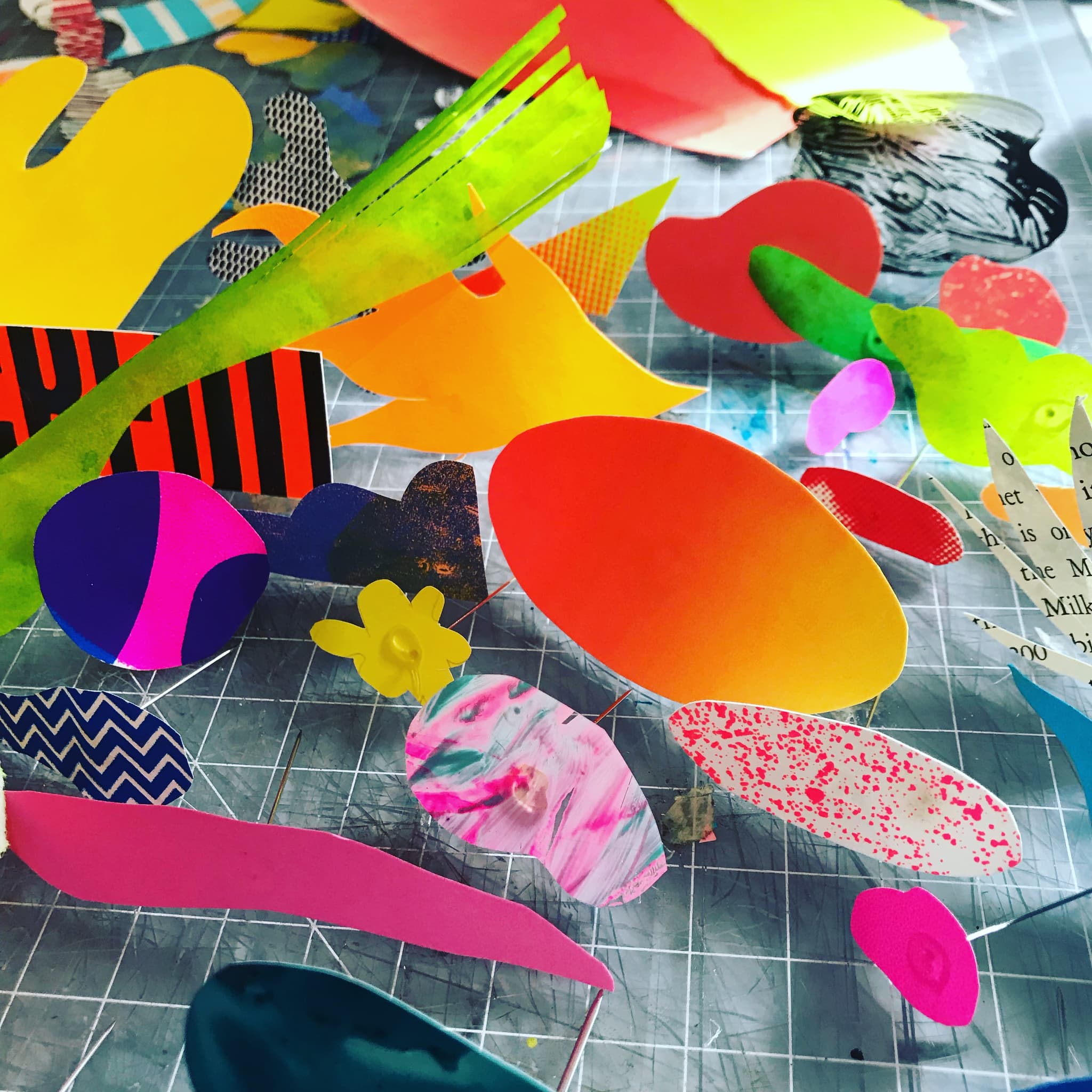 “I’ve been trying to keep away from purely digital work,” Erdelyi notes. “Partly I think it’s just because I have this background with craft and working with my hands and touching things, so I consider the work I’m doing a hybrid animation process. It’s analog and digital combined.” That’s also true of her second work in the exhibit, a new wall piece called Ma Femme Maison (2019) that presents two exuberant collages connected by a hot-pink umbilical cord. These riotous forms arise from found papers and monoprint scraps that have been carefully cut like lace, bored with holes like Swiss cheese, or fashioned into orbs, organs, feathers, and flowers. Most of the colors are neon-bright hues hard to find in nature, but the shapes are organic, by turns botanical, aquatic, anatomical, cosmic. Each wild yet delicate assemblage surrounds a small LED screen that plays looping animations inspired by nineteenth-century drawings of developing embryos.