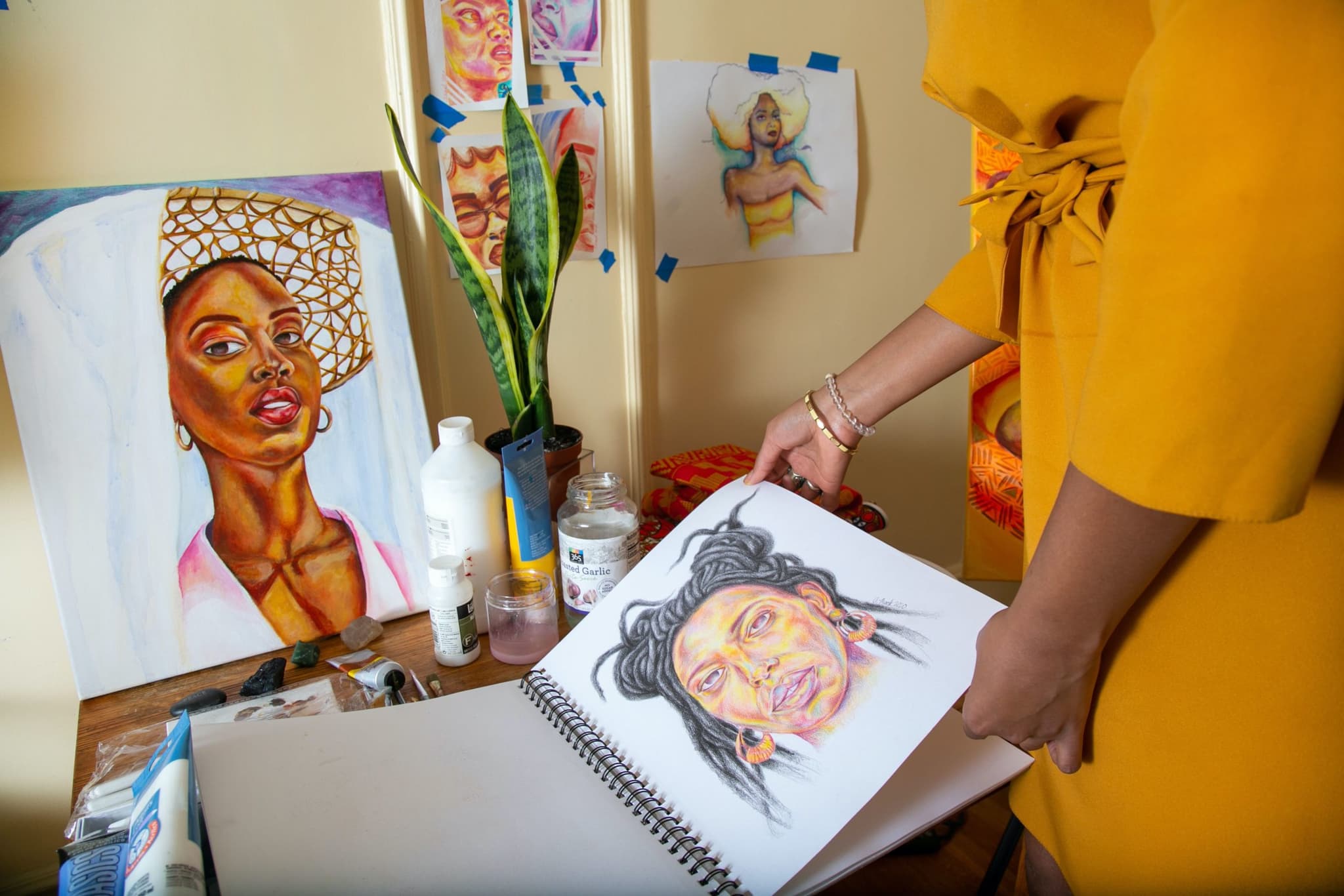 Portraits of various Black women with luminescent skin rocking top-knotted dreadlocks, buzz cuts, or free-flow-ing, untamed kinks are just some of the pieces that fill Mack’s portfolio. Her iconic headwrap pieces, which are sketches of featureless faces beneath colorful patterned fabric, seem to create space for viewers to connect with and imagine themselves within the work.