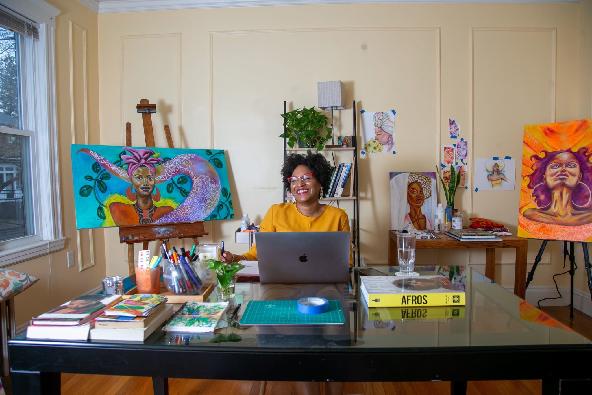 That’s part of what makes Mack’s art so special. When Sheena Collier, consummate connector and founder of Boston While Black (BWB), came across one of Mack’s paintings that she recently purchased, she thought, “Is this a replica of me?” she says. That feeling is part of the reason Collier admired the work. Years ago, Catherine Morris, founder of the Boston Art & Music Soul (BAMS) Fest, met Mack at a holiday event where Mack was selling her work. “We talked a little bit and I fell in love with her [and] her art,” Morris says. “At the time it always seemed to just represent the many dimensions of what it means to be a Black woman. And I appreciated that. And to see that locally was such a powerful connection that I loved about it.”