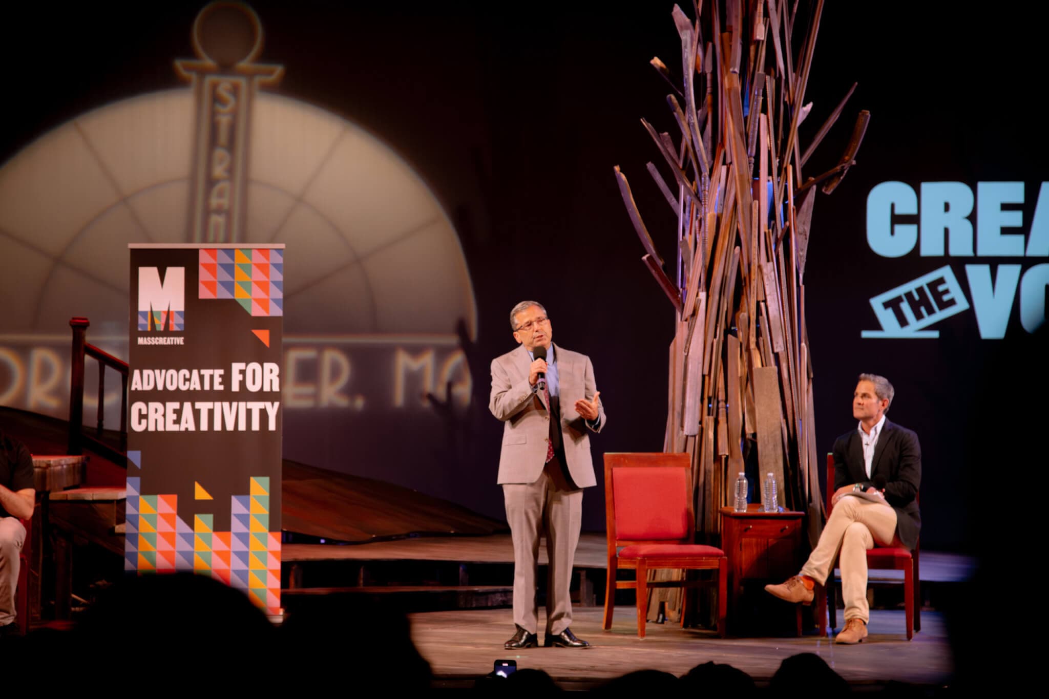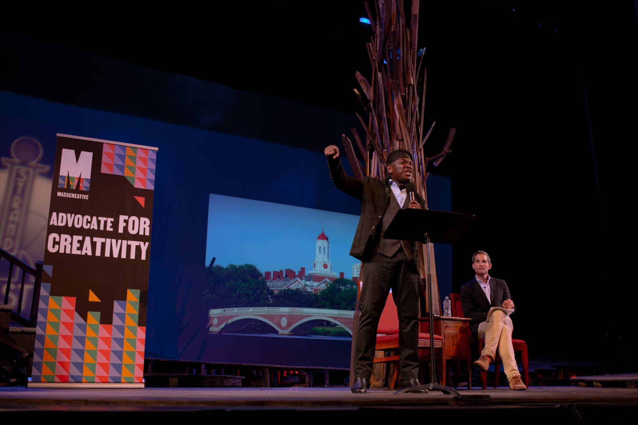 Ranging devastating funding cuts to displacement and dreams for stronger arts education, inquiries were curated by Bowen based on responses from the 750 registrants for the program organized by MASSCreative. The collective energy was palpable, with hundreds of community members scoffing, laughing, and cheering “Go on now!” to candidates into the night.