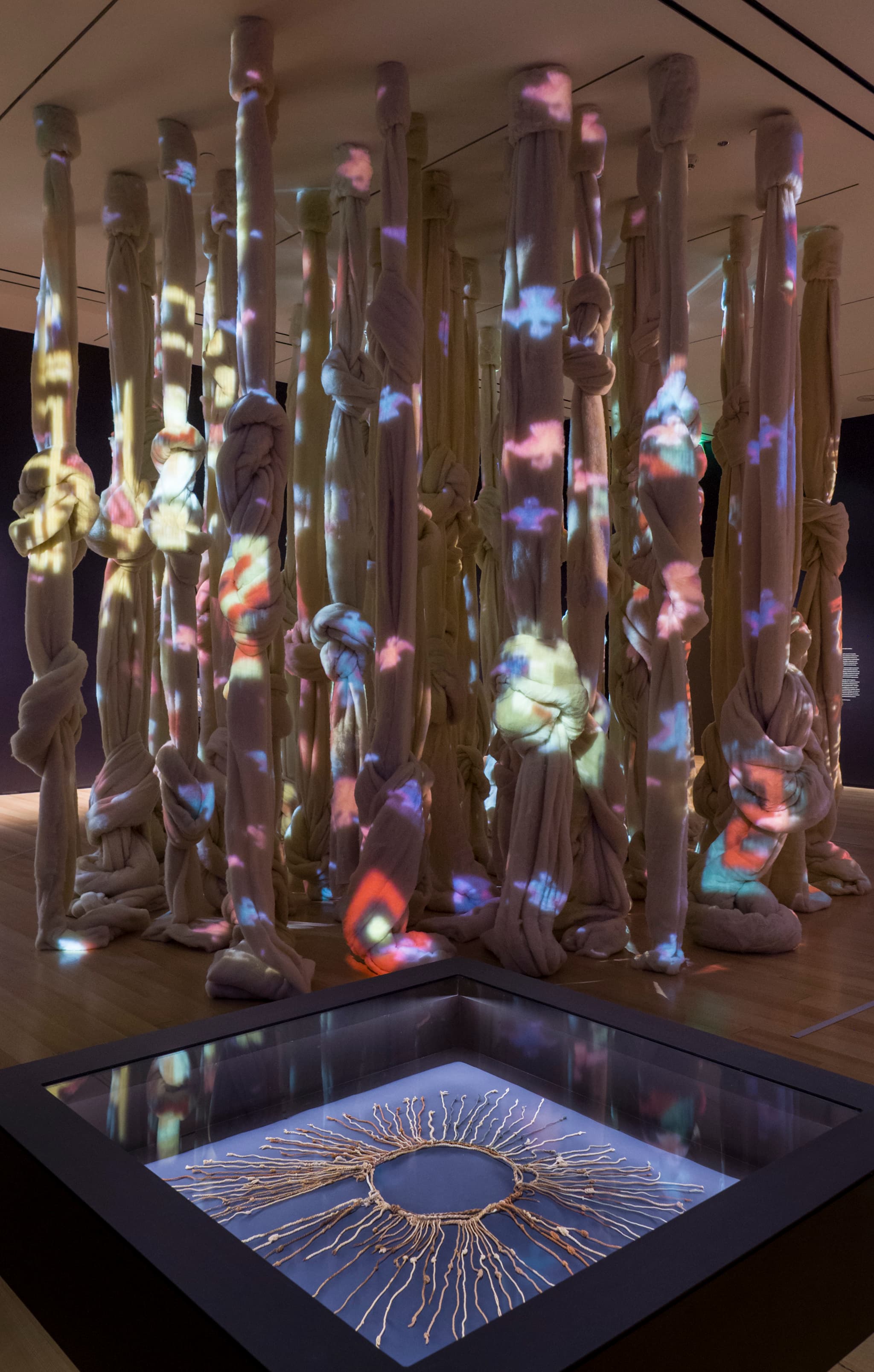 On the occasion of Vicuña’s exhibition at the Museum of Fine Arts, Boston, “Disappeared Quipu,” the artist created a site-specific, large-scale installation that stood alongside five historical quipus from the Peabody Museum of Archaeology and Ethnology at Harvard University. Using massive swaths of unspun wool, the quipu sculpture became a site for visual projections of textiles that Vicuña selected from the Andean collections at the Brooklyn Museum and the MFA.