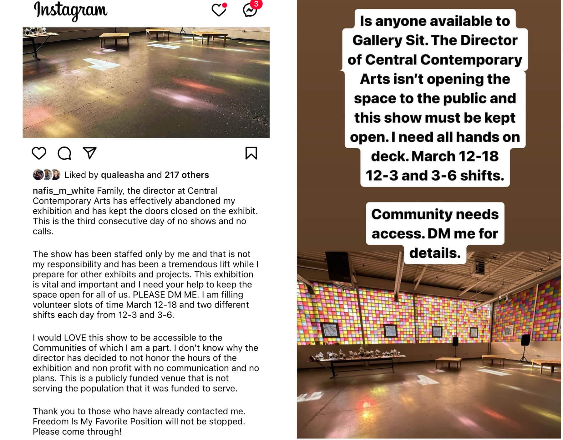 (left) A post made by Nafis M. White on her personal Instagram on March 10, 2023 is the first instance of White’s public calls to garner volunteers. (right) White uses her Instagram stories to update followers about the status of the space, the volunteers, and her interactions with CCA as pictured here on March 10, 2023.