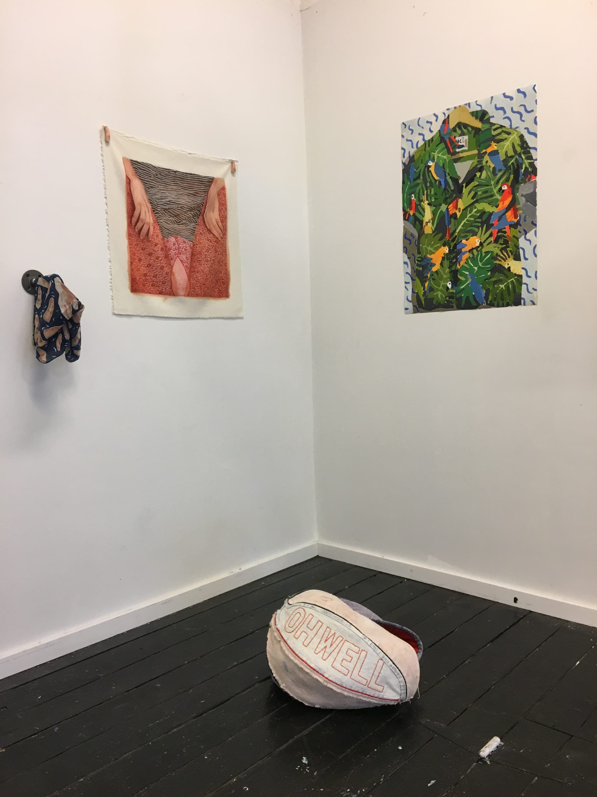 Finally, the discussion of female identity and voice in a #MeToo media world, takes on a somewhat apolitical, more personal stance in Sophie Treppendahl’s paintings, the most traditional artwork of the three artists. Her work features simplistic yet colorful renditions of common clothing items: a Hawaiian print shirt, a vintage t-shirt, a simple patterned blouse. By removing the wearer of the clothing and instead capturing the pieces themselves, Treppendahl’s ideas correlate with Riesing and Bernier’s decision to extrapolate meaning from clothing choices. While the former two are concerned with female body and space through clothing, Treppendahl leaves the viewer with little to no information as to the wearer of the clothing. Yet, from speaking with curator, John Roy, the pieces are meant to reflect items from friends and loved ones of Treppendahl. Without such context presented with the paintings, one is left to perhaps imagine trying on each piece of clothing, disintegrating long-held notions of gender performance and clothing associated with each gender’s outward appearance. She leaves the decisions of object and owner up to the viewer, perhaps instilling agency in the viewer to wear clothing that falls in line with their aesthetic preference versus what might look best on the female or male body.