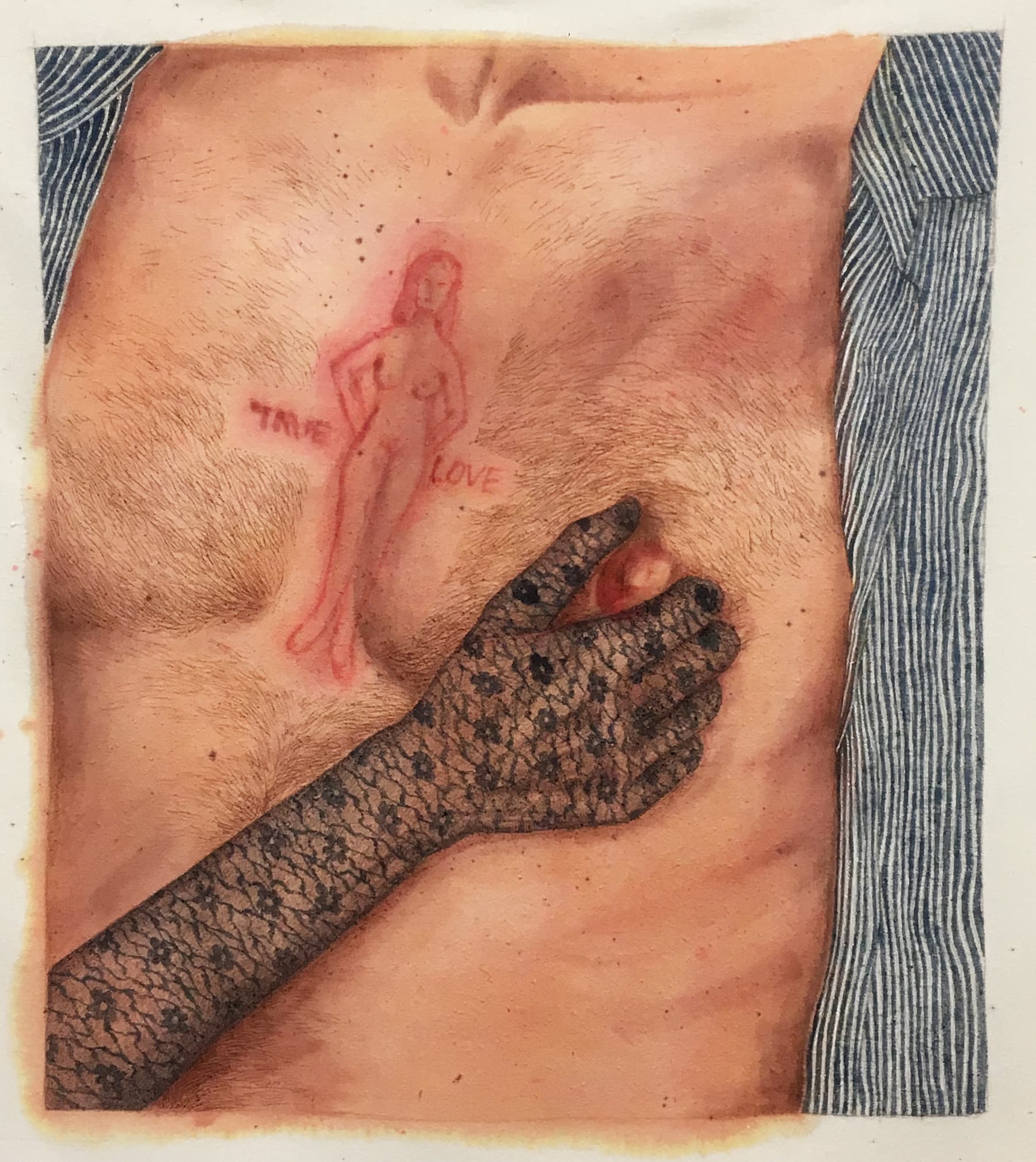 Artist Katarina Riesing presents works in several media, most prominently displaying a rack of clothing with hand-embroidered stitching of various body parts onto coats, shirts, and scarves. The rack is inviting, demanding the direct engagement of the audience as one works through the rack of reworked garments. Her stitched hands, often with severed fingers and playful drops of blood, dominate both a simple cotton stretch bodysuit and a reworked denim smock dress, foreboding the fate of anyone audacious enough to touch the individual wearing the garment. The artist also works with silk scarves and dyes them with neutral tones. The delicate silk prints portray various perspectives of the female and male body, with both male and female genitalia being explicitly or implicitly displayed for the viewer to connect with. The overarching feeling of the silks is one of female dominance and control, as a lace-ensconced hand wrings a male nipple with the words “TRUE LOVE” etched into his chest with a razor. Here, in Riesing’s world, female pleasure is derived entirely from female agency and operates to subvert the notion of female objectivity and passivity. The simplistic clothing bring the female body to the forefront and suggest femininity and eroticism without the traditional notions of sexual pleasure as determined by unrealistic images that are typically forced upon women.