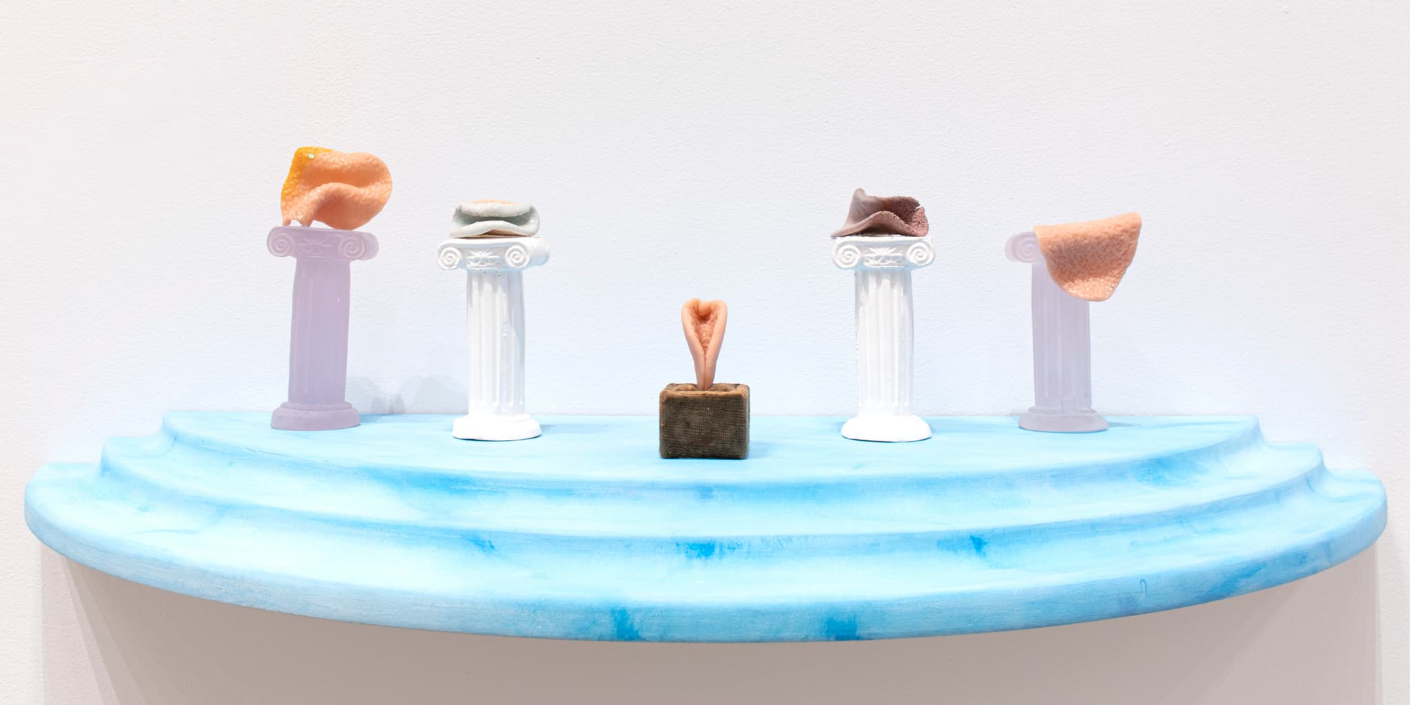 Pamela Council, Ringholders, 2016-ongoing. Doll-face porcelain, dollmakers sculpey, jewelers ring displays, nail polish, rhinestones, crack pipes, glue, with artist-made painted wood shelves. Dimensions variable; 36″ x 13″ (shelves). Photo courtesy of the artist.