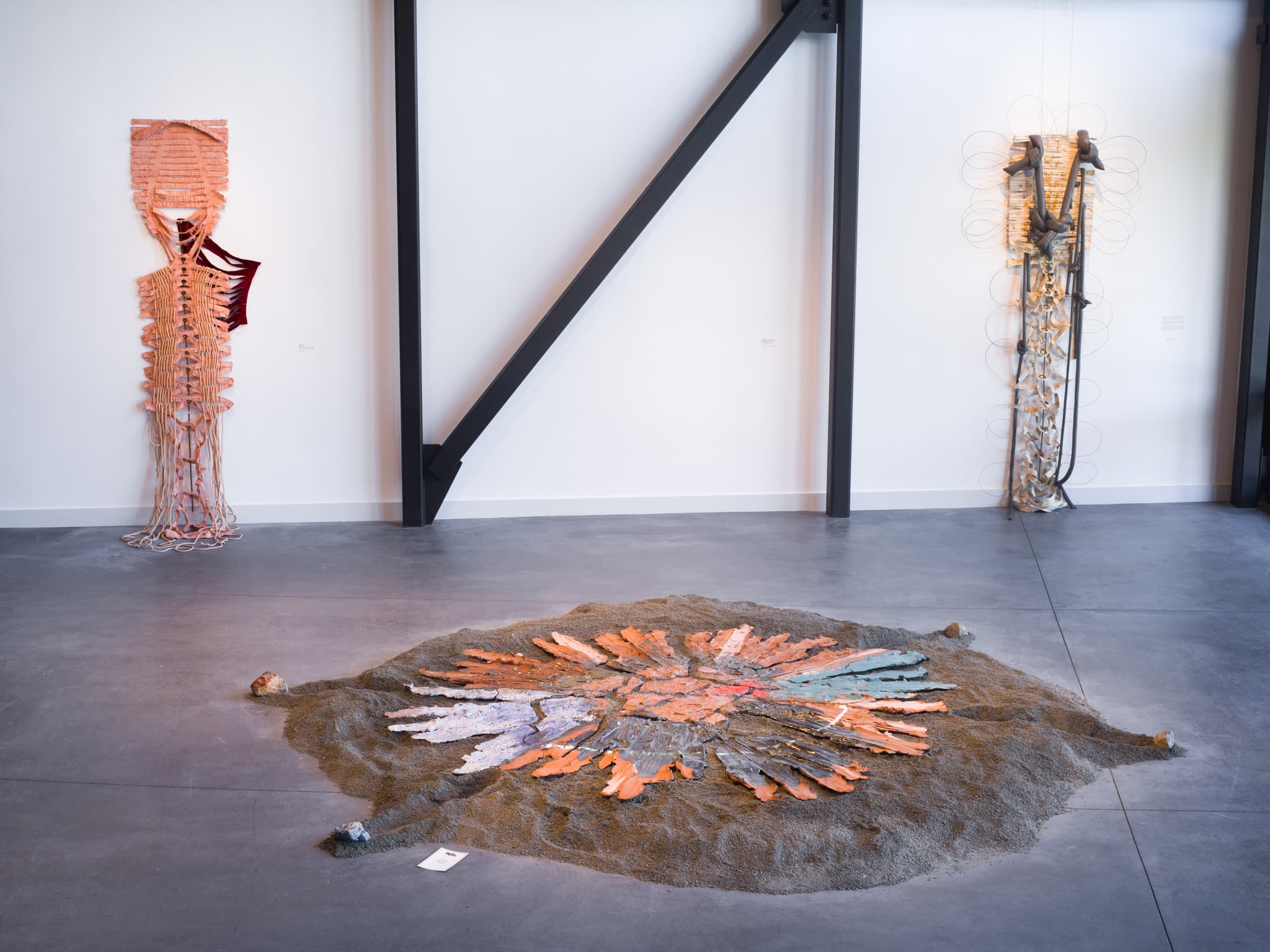 Installation view of “Broken Open,” Museum of New Art, Portsmouth, NH, April 19 – September 25, 2022. From left to right: Joy Curtis, Atlas, 2019; Brie Ruais, Spreading Out from Center, Anchoring in Place, 2021; Joy Curtis, Wonder Valley Channel, 2020. Photo by Peter Morse.