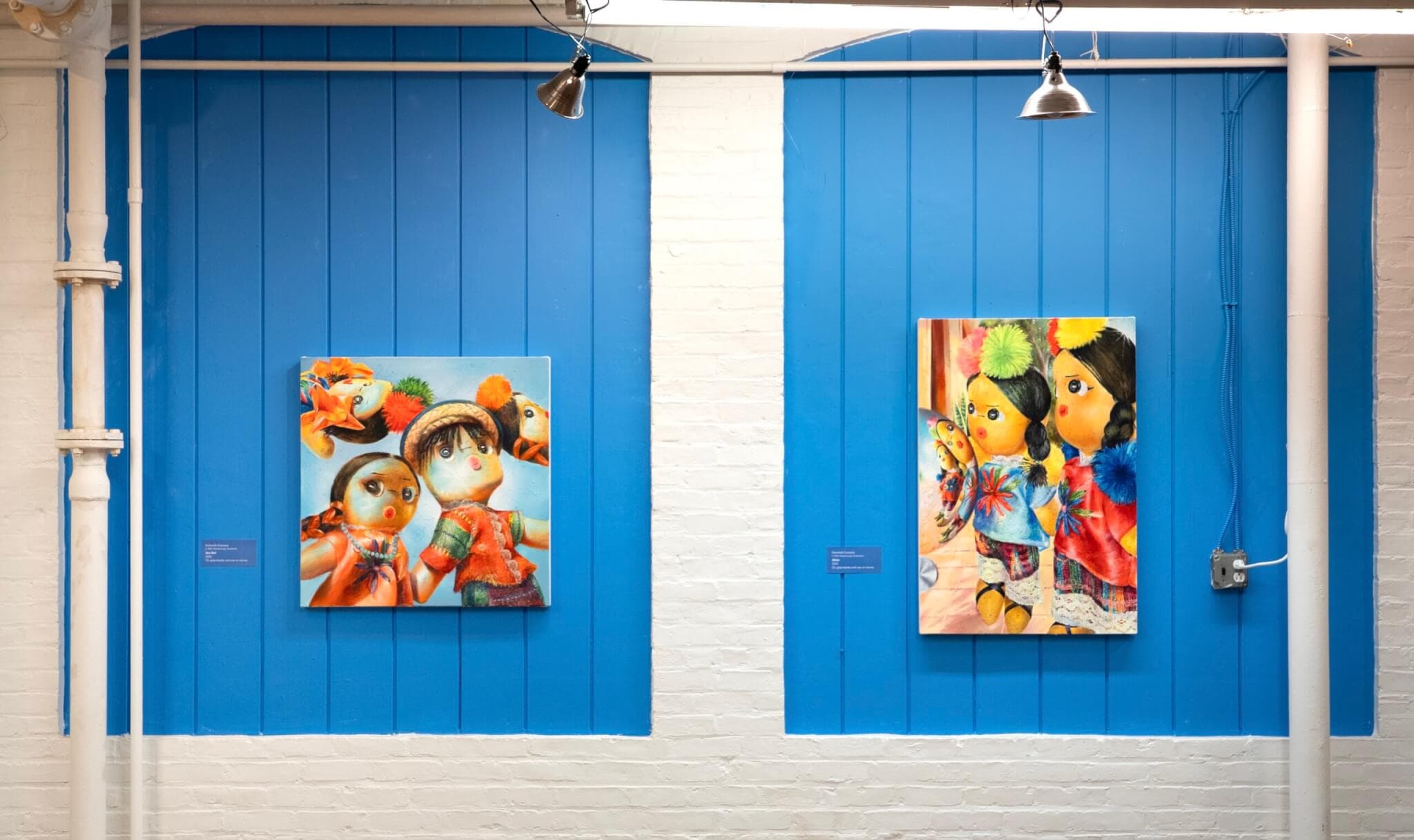 Vibrant paintings of worry dolls hang on the blue walls of a gallery space.