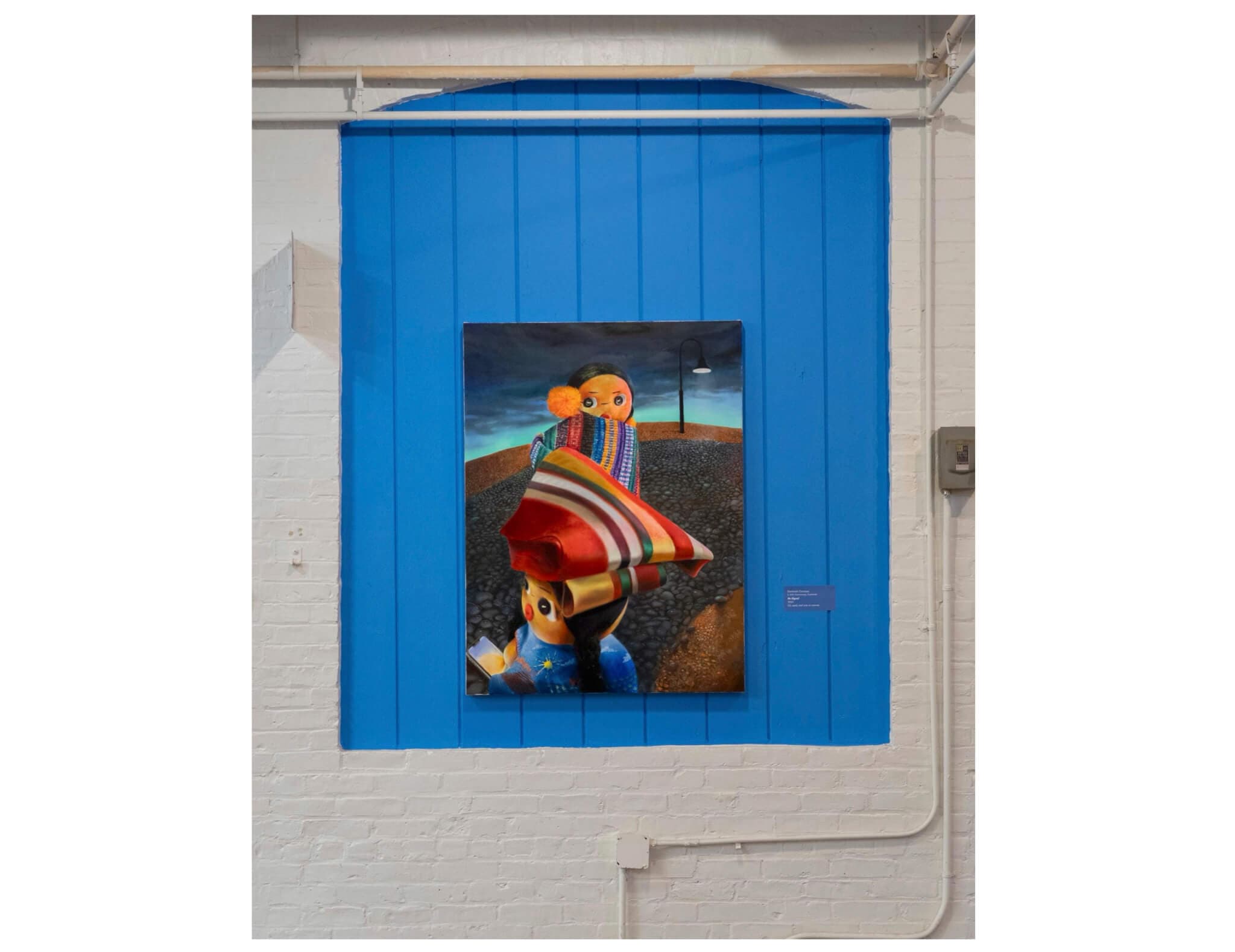 Installed at Aunty’s House, an artist-run space, in Providence, that has artist studios and hosts exhibitions and community programs, “Me acuerdo” brings together a large body of Cocozza’s works that have latent visual references to the Indigenous craft and textile traditions instrinsically shaped by the Guatemalan Civil War. The thirty-six-year-long conflict resulted in a genocide of Mayan people and the forced displacement of thousands from their ancestral lands. Painstakingly handmade by Mayan women, these now-celebrated Guatemalan wearable textiles and crafts are palimpsests of history and memory, containing the material evidence of Indigenous peoples’ survivance over the decades.1 The worry dolls, in Cocozza’s adept hands, become yet another vehicle for storytelling, and in this case, brilliantly illuminate the creativity of Latine and Indigenous contemporary artists whose artwork builds new worlds north of the US border. Jumping in scale from massive to intimate, I am most interested in the ways that the paintings in “Me acuerdo” lean into the nostalgia of a lost childhood while simultaneously refusing the anthropological imperative to relegate Guatemala’s Maya Tz’utujil communities to the past. In the largest and most dynamic paintings, the worry dolls engage in daily, or common, activities familiar to most viewers in the US regardless of social or geographic location: drinking and sharing chisme, or gossip, among friends; protesting for Indigenous and migrant rights; meeting in the park to celebrate with fireworks after dark. These actions are universal and contemporary: Cocozza’s dolls very much inhabit our present world from their respective locations suspended between childhood and adulthood.