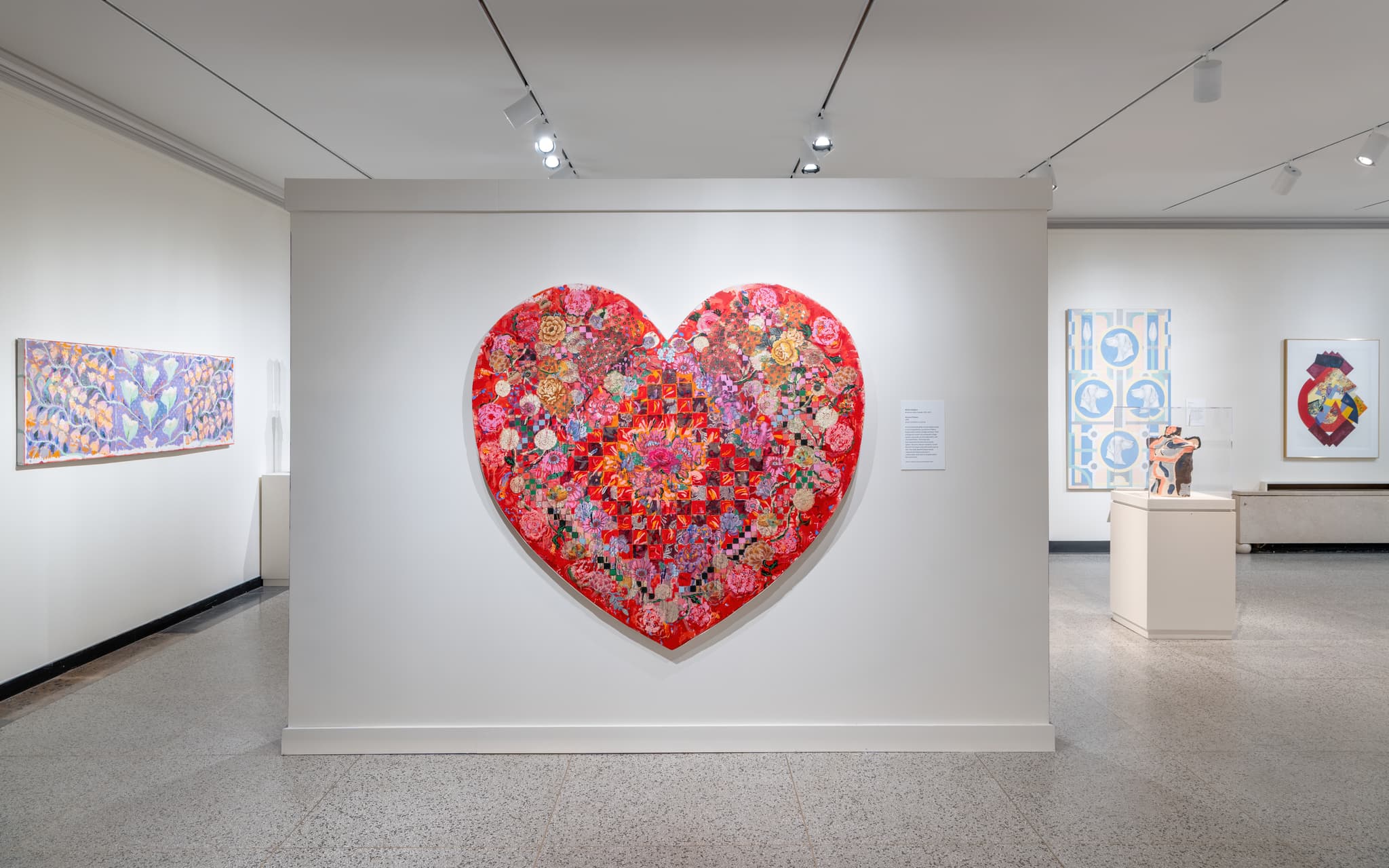 Beyond the entryway and central annex of the Currier Museum of Art, the first room of “Embellish Me: Works from the Collection of Norma Canelas Roth and William Roth” beckons with a bright, seductive allure. Under a lilac-painted arch and a horizontal board emblazoned with the exhibition title, a large red heart hangs on a free-standing, museum-white wall: Miriam Schapiro’s Atrium of Flowers (1980). This giant valentine shimmers with metallic gold and abundant blooms reminiscent of Victorian paper ephemera. Or perhaps it’s a Sacred Heart; its orange acrylic paint strokes radiate flamelike from its center, with vines and gilded surfaces recalling Catholic iconography. Interspersed amongst the visual splendor is a checkerboard pattern of cut-and-pasted fabric squares, conjuring patchwork or quilting. The label multiplies associations, likening the work to “crazy quilts, printed tablecloths, and chocolate boxes.”