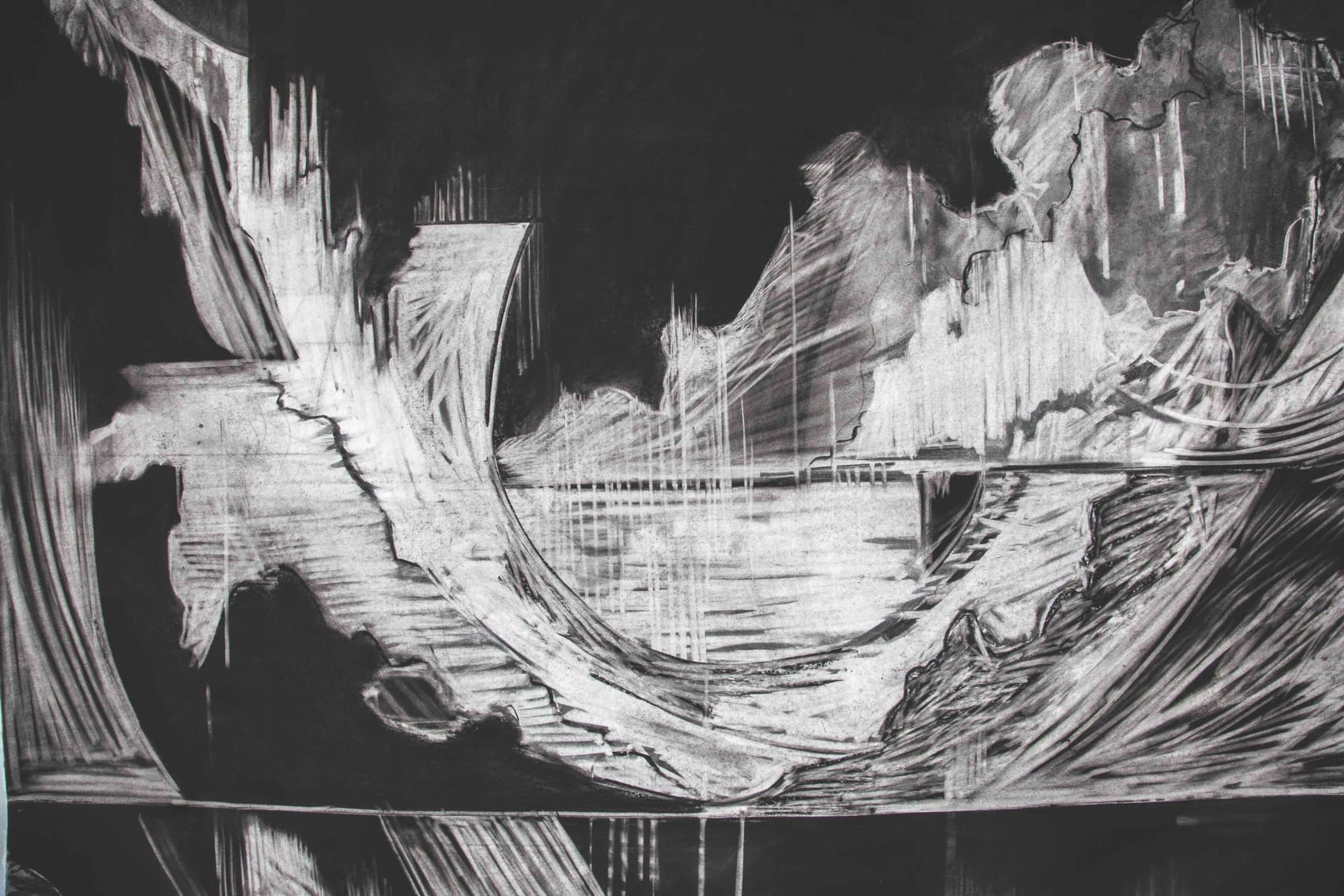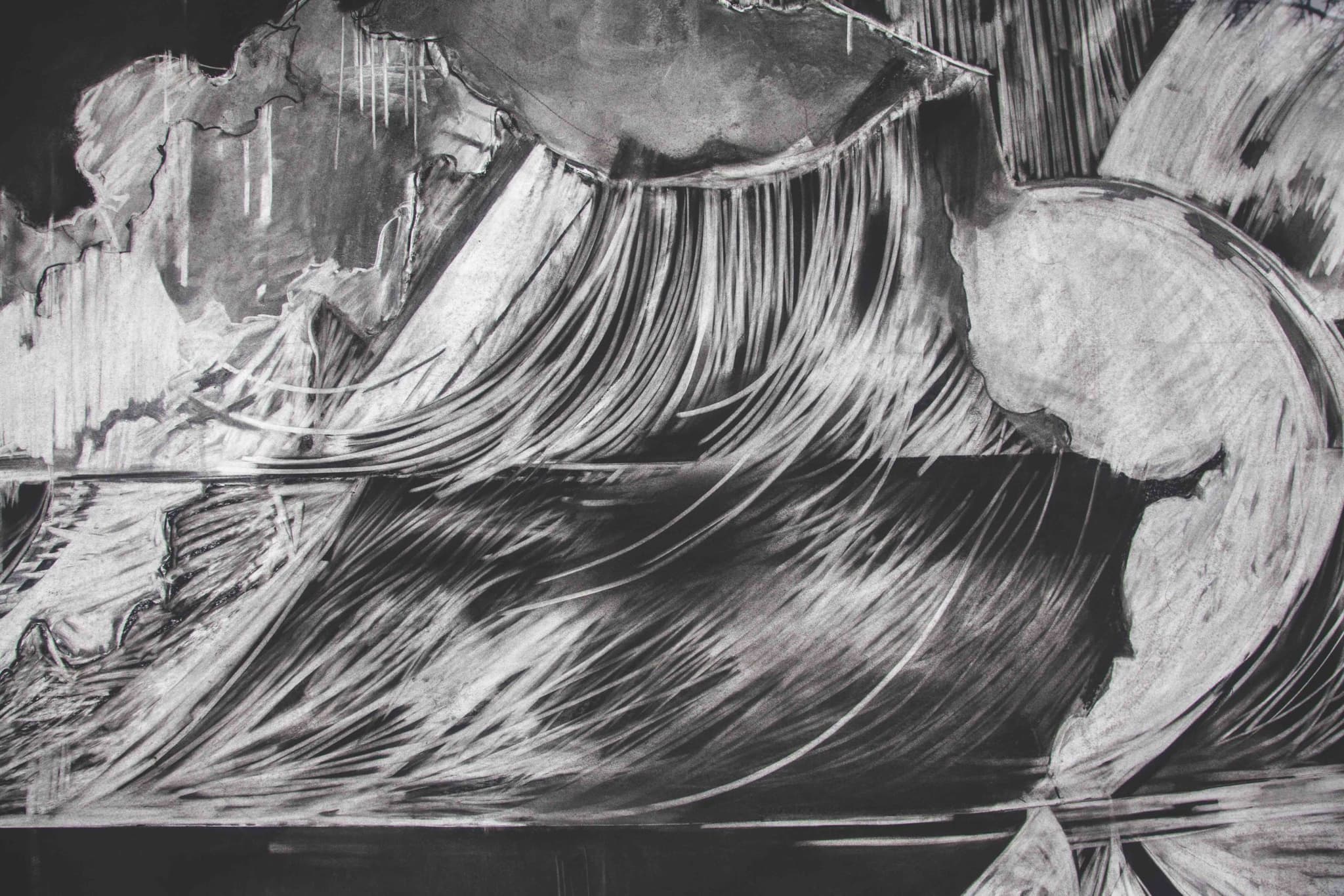A New York-based artist and Montserrat alum, Modisett makes monumental charcoal drawings that reflect her interest in ecological processes and the collision of natural forces and human activity. The tectonic drawing is tense, like a portal into an unknown yet vaguely familiar world that captures the human body in not only spaces of upheaval and disintegration, but also evolution and spirit.