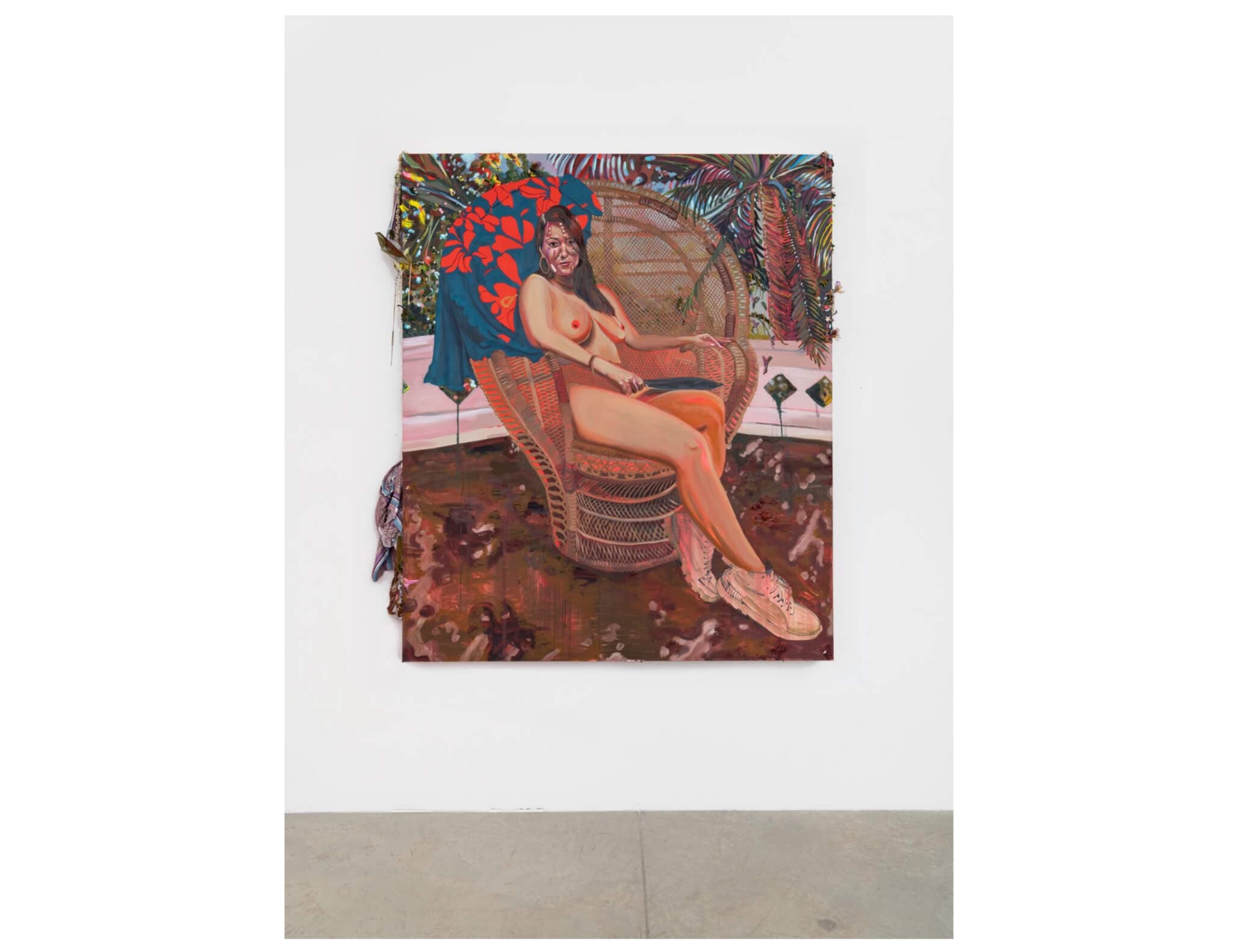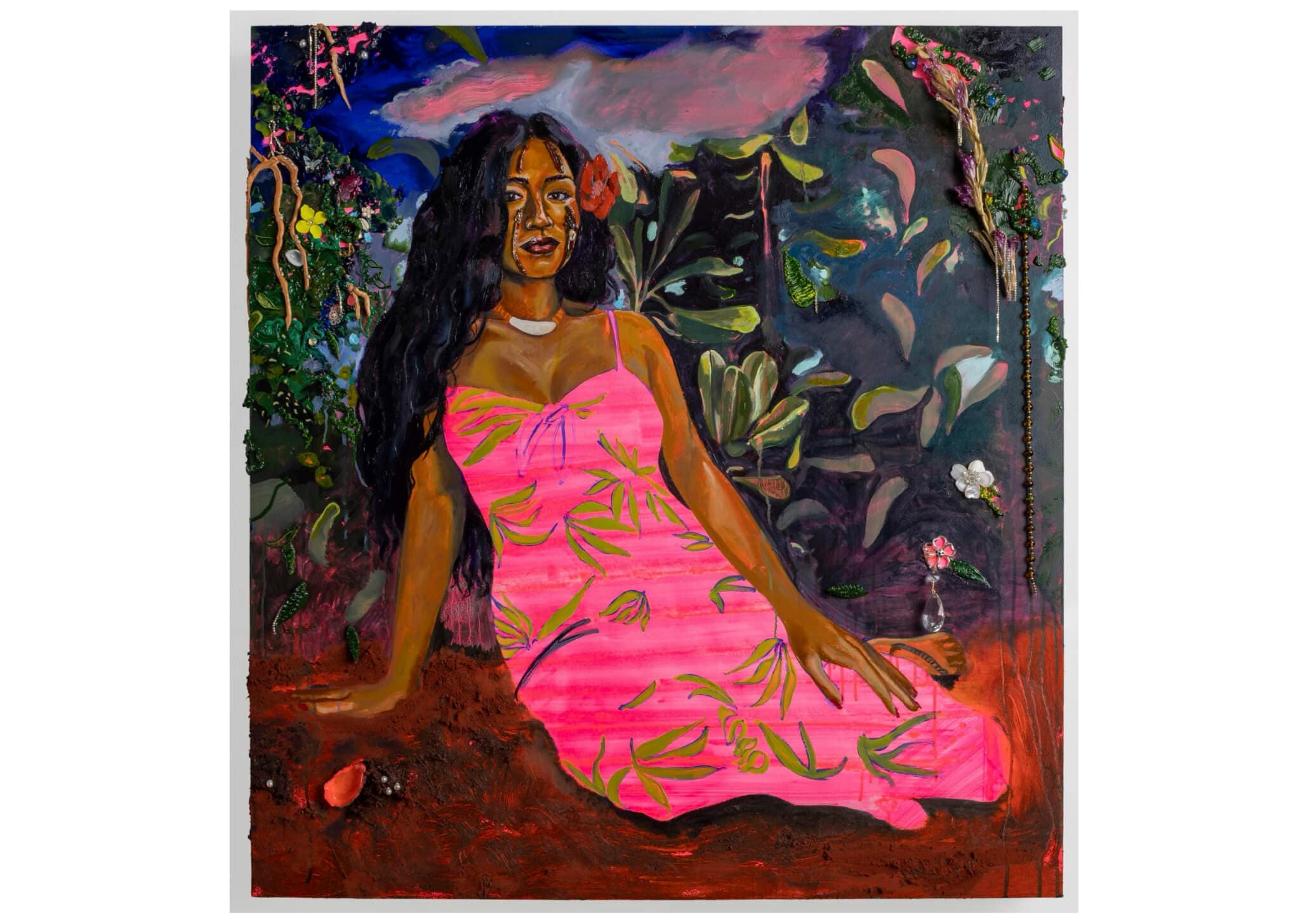 McDaniel’s oil paintings, embedded with personal and oceanic memorabilia, feature highly present, semi-nude female figures, permeated by tropical shades of pink, yellow, and green. These bright, almost celebratory tones function as a Trojan horse—drawing viewers into more serious reckonings with sexual and colonial trauma. Holding the active gaze of the sitters, I realized that my inclement journey, ending in a kaleidoscopic horizon, parallels the bond between the artist and her sitters. McDaniel’s work explores sexual and colonial trauma and transforms its wretchedness into a collective bond, an atmosphere of autonomy and presence that instantly registers as upending the asymmetrical painter-sitter relationship.