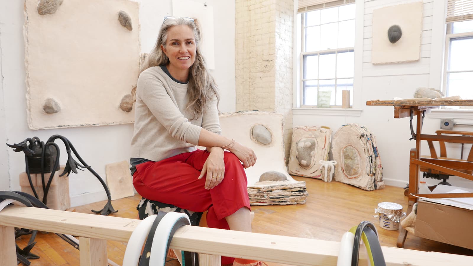 Tory Fair stands over a table in her studio, looking at sculpture works.