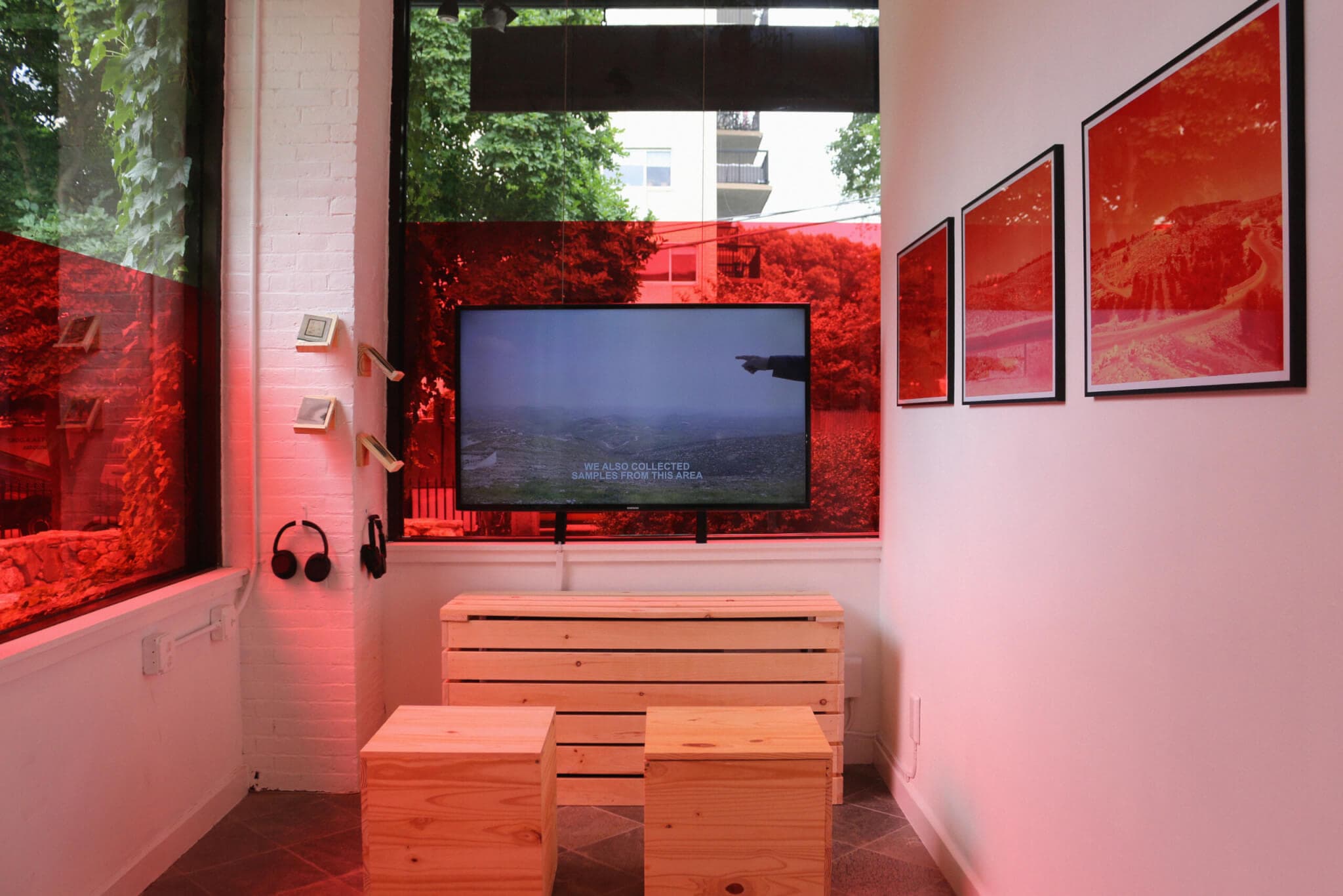Inas Halabi’s exhibition, “To a Returning Cloud,” at Brookline Arts Center includes six of the images that this unnamed woman might have taken, hung in a row opposite the gallery’s large windows. Each photograph shows a quotidian landscape in the West Bank, tinted deep red: rows of houses on a horizon, a dented metal traffic barrier, and a fiery patch of cacti. The streaks and bubbles of light that bloom across their surfaces indicate that the color was not added in digital post production but rather with colored gel sheets. The number of sheets used while creating each image corresponds to the site’s recorded quantity of Cesium-137, a radioactive isotope produced by nuclear reactors and weapons. An image of a horse in Hebron is mediated by three gel sheets layered over the photo, corresponding to 7.9 Bq (becquerels) of Cs-137. A bucolic image of hills and trees in Khirbet al-Taybeh uses ten filters, corresponding to radiation levels over three times as high. A red gel is applied to the gallery’s windows, framing both the institution and its surroundings as irradiated space.