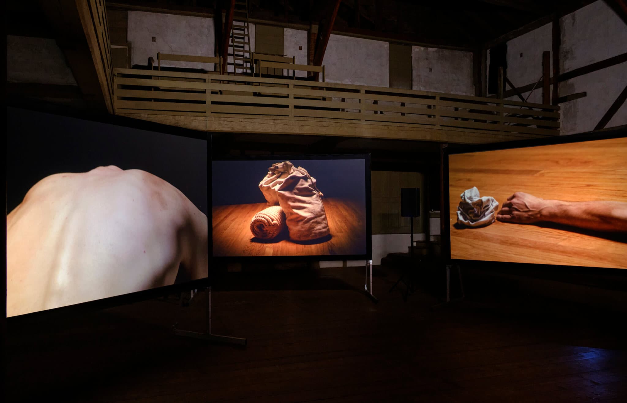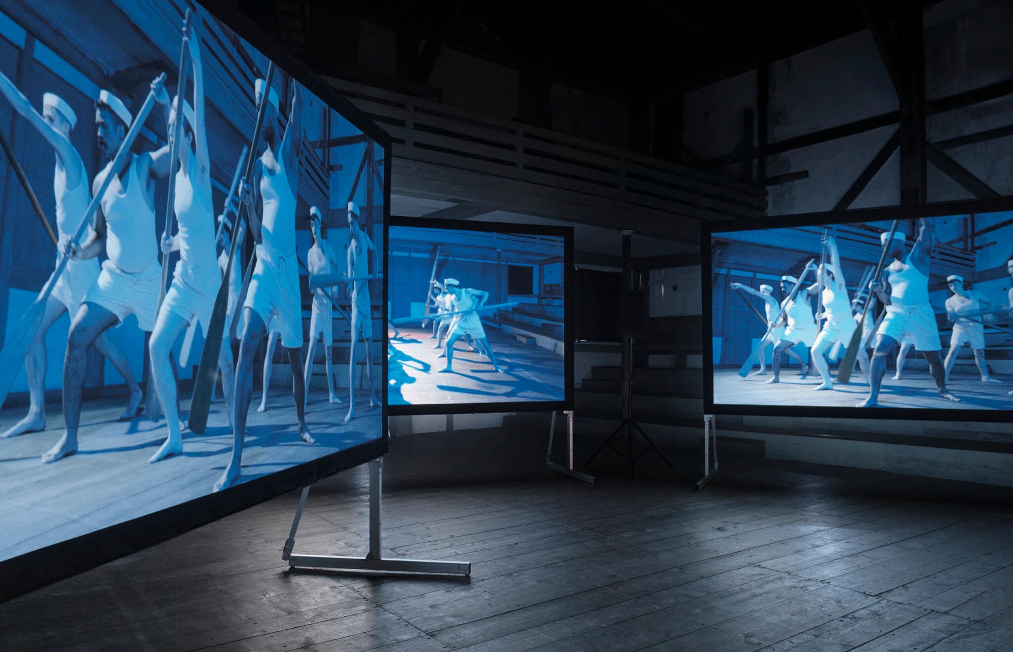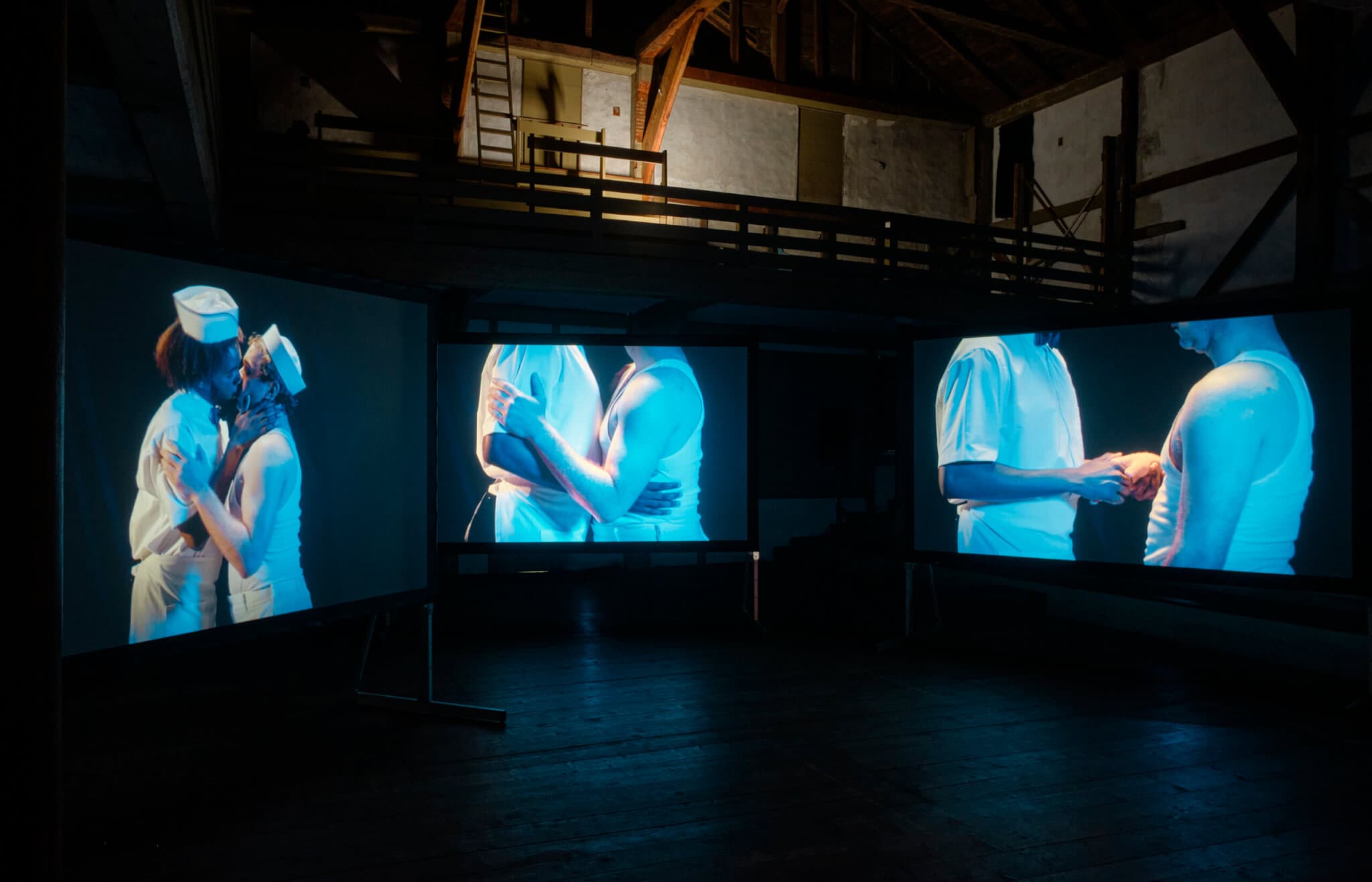 Enter Matthew Lawrence and Jason Tranchida, Rhode Island artists and co-editors of Headmaster, a journal they describe as “the art magazine for man-lovers.” Their new hour-long three-channel video, Scandalous Conduct: A Fairy Extravaganza, screened on a loop this fall at one of its period filming locations in Newport. More provocation than essay film or documentary, the piece switches between evocations of the Newport sailor entrapments and recreations of the historical Navy-made musical The Strange Adventures of Jack and the Beanstalk: A Fairy Extravaganza, which toured the area in 1919. Walking in at the middle of Scandalous Conduct, you could be forgiven for thinking you’d stumbled across Warhol screen tests from the 1960s intercut with scenes from W.S. Gilbert and Arthur Sullivan’s comedic operetta H.M.S. Pinafore (1878), but the film’s mood is ultimately more melancholy. It is a form of cultural restitution to unearth the Navy’s actions, bring the 1919 incident back for consideration, and mix artifacts of popular theater and police action. The theater scenes are better performed than the sailor reenactments, which at times feel stilted, but the piece raises ideas worth considering. Lawrence and Tranchida’s playful and speculative approach to history is a distinctly queer tactic, and although they don’t reference Cadmus’s paintings directly, the sexualized sailor is their focus.