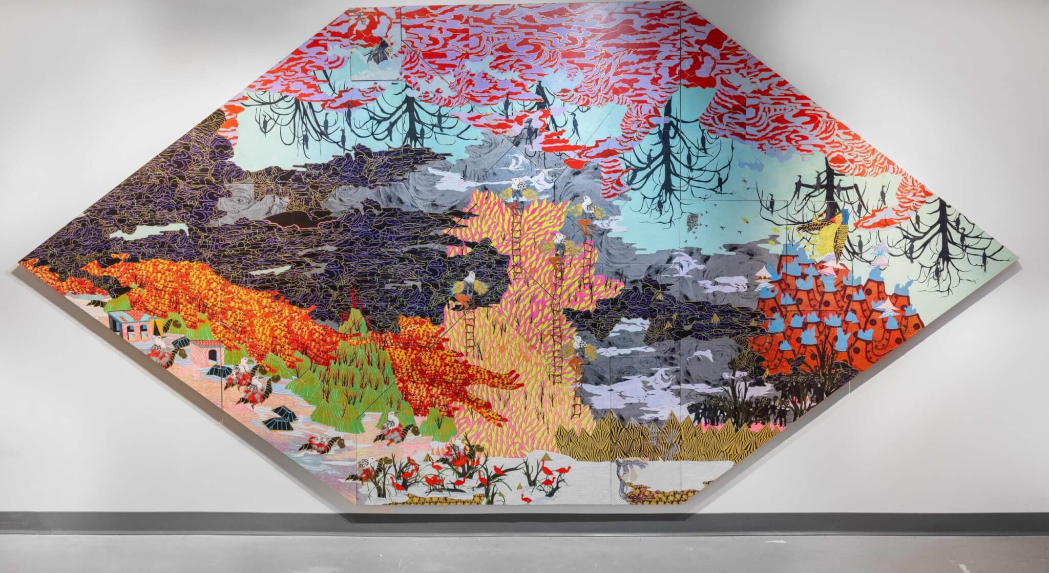 Her earliest work on view, Between Saint Souci and the Setting Sun (2007), is a jigsaw of screen printed and collaged panels that coalesce in a monumental eye. Something between a surrealist landscape and a narrative scene, the work’s internal tension is generated by contrasts. The roiling composition circulates my attention around the touchpoints between land, sky, and sea, populated by mutated birds, hybrid creatures, and portraits based on likenesses of Hong’s family. Made for the 2007 deCordova New England Biennial, Setting Sun embodies the textures and iconographies familiar to her work, but is also evidence of the constraints of the labor of art-making.