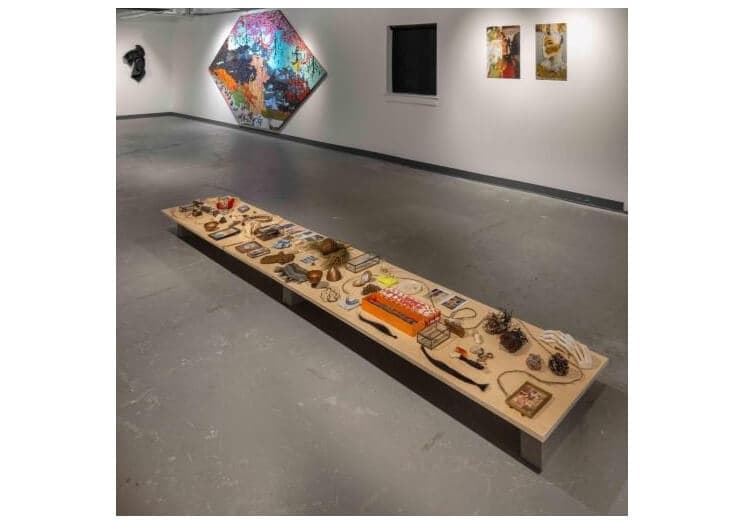 Jungil Hong, Dinner Table, 2024. Various objects. 10” x 144” 42”. Installation view, “The Time Being,” ODD-KIN in East Providence, RI, 2024. Courtesy of ODD-KIN.