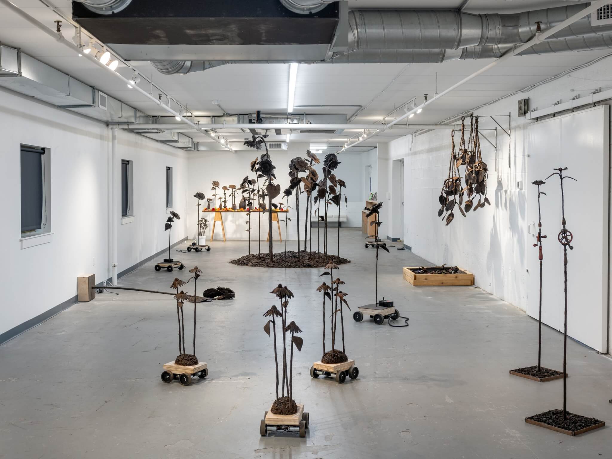 With charm and wit, Tory Fair’s “Protest Flowers” turns the gallery into a field of unexpected contradictions. Fair’s kinetic sculptures are rubber-cast sunflowers laced with dirt that perform a series of strange choreographies. Peeking out from boots, towering over ten feet high, or attached to tiny carts, the silicone flower sculptures protest their own obscure artificiality while performing their floral ornament duties. Some tremble on the floor in slow spirals, some are cheeky and mobile, others respond to remote controls guided by visitors. Fair situates her work within a canon of ecofeminist artists who employ abstraction, land interventions, and performance to call attention to the state of the planet while fostering moments of connection, humor, and reflection.  —Jameson Johnson