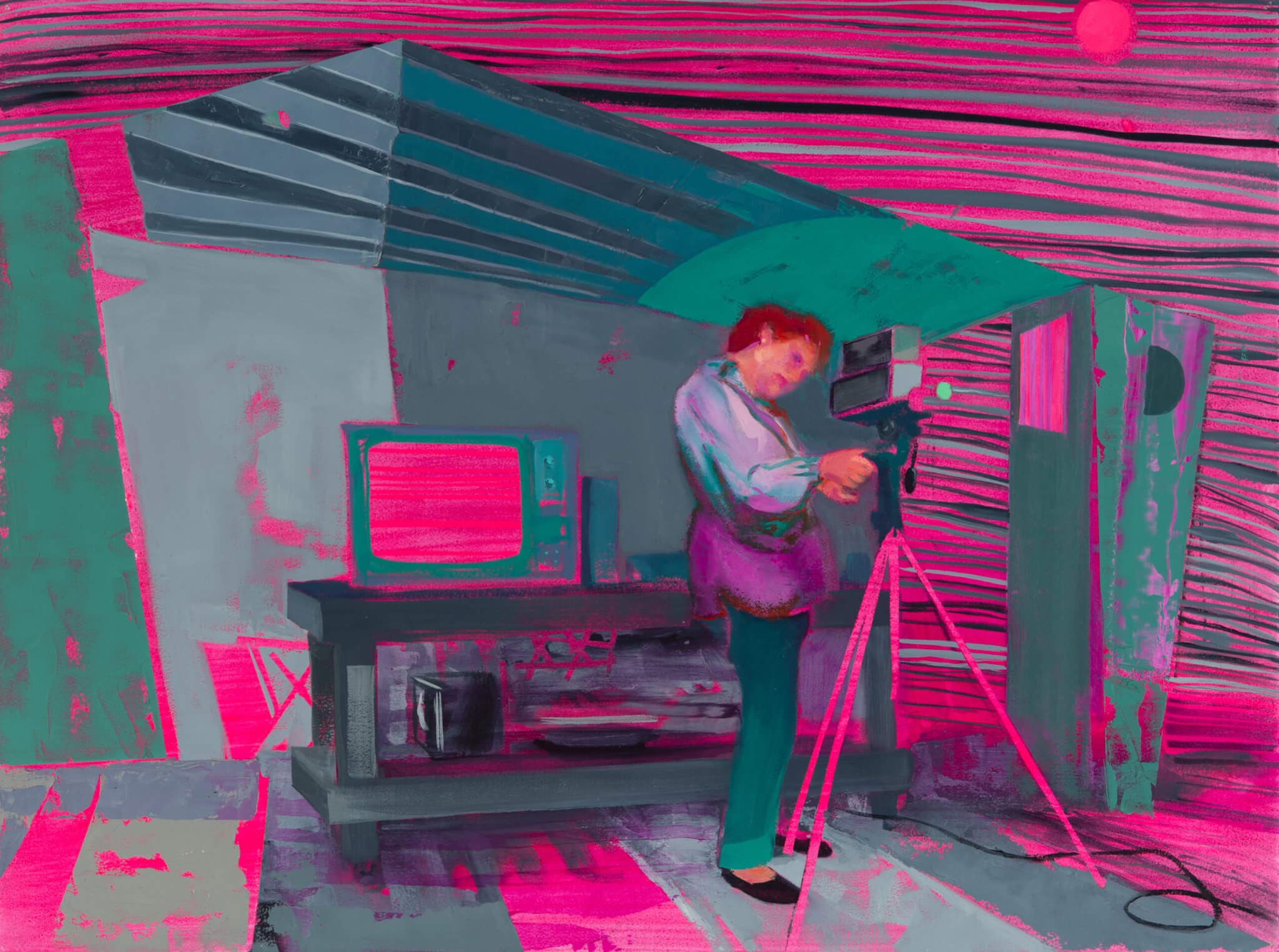 I’m writing this on a dishwater gray day in May as a Nor’easter stumbles in from the wrong season, and the fluorescent colors of Suzanne Schireson’s canvases—hot pink, fuchsia, violet, turquoise—feel downright phantasmagoric, like phosphenes seen with closed eyes after a night of interrupted sleep. Drawing on histories of artist parents like Ruth Asawa and Barbara Hepworth, as well as visits with contemporary ones, the Rhode Island–based Schireson paints a studio of sorts for each of her subjects. But some of these structures are no more stable than the library my three-year-old built from Magna-tiles yesterday. One is just scaffolding, open to the sky and trees. A shed seems too small to stand in; skylights might be holes in the ceiling. In one painting, a woman writes at a desk beneath the bare bulb of the moon. One way or another, the outside world enters these imagined makeshift spaces. The figures in these paintings are working anyway, usually at night and sometimes with a child close at hand, and I am reminded that sanctums are overrated, that caregiving and creating are not antonyms, that our work needs the world and vice versa.  —Jacqueline Houton