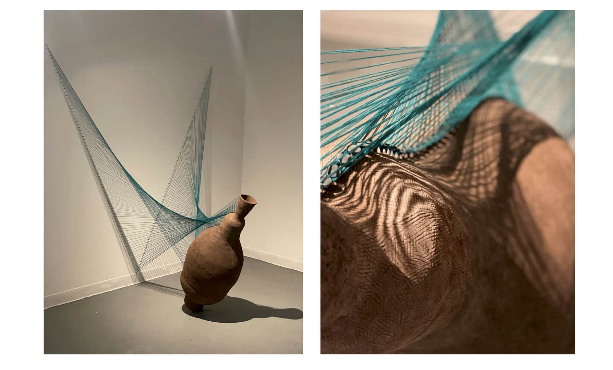 Anis Beigzadeh, Let It Go, installation view (left) and detail (right), 2023. Ceramic and fiber. 6 x 5 x 4 ft. Featured in the “Best of SouthCoast” exhibition juried by Carmen Hermo on view at the New Bedford Art Museum June 12–August 31, 2025.