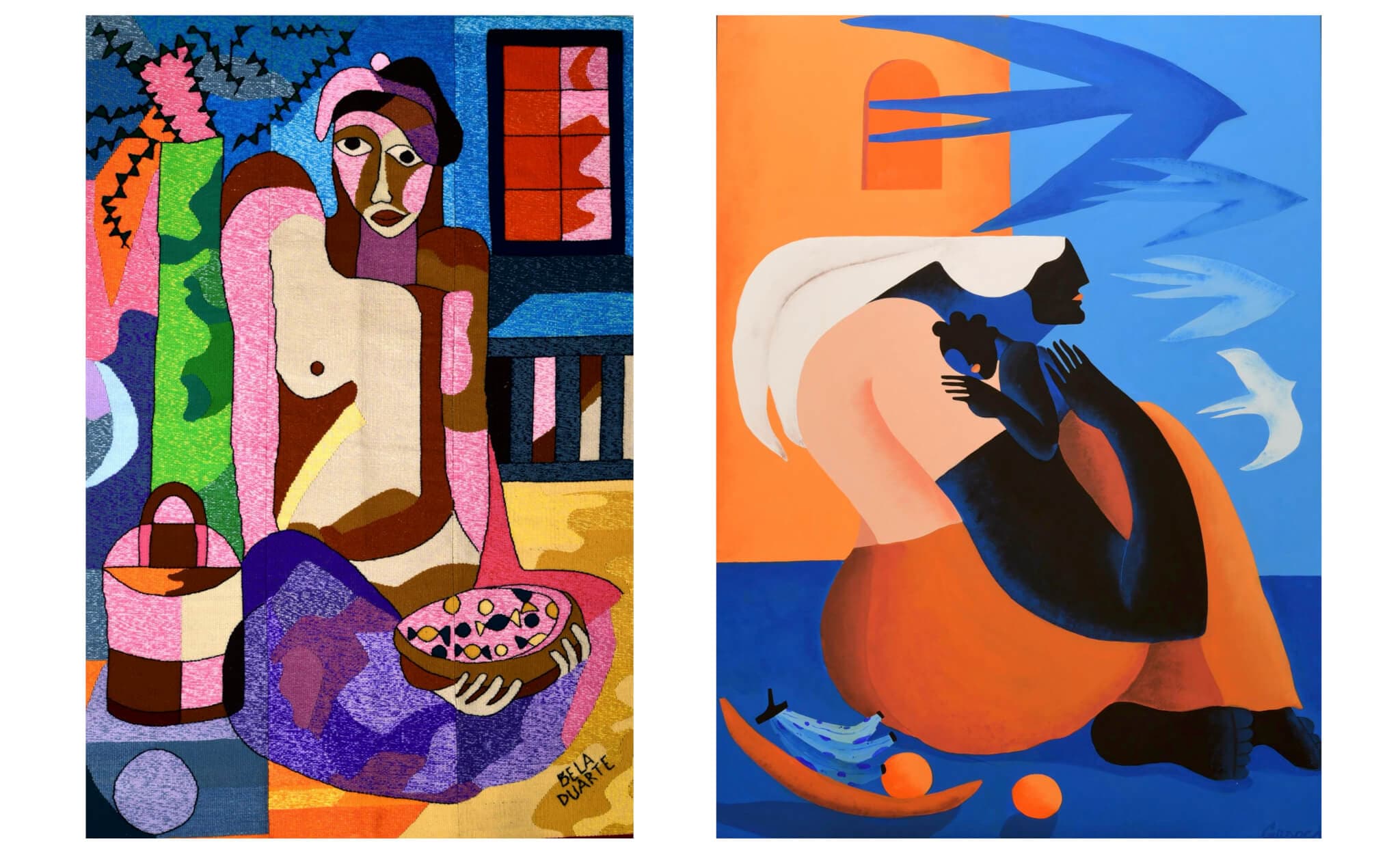 (left) Isabel “Bela” Duarte (Cape Verdean, 1940–2023), Candy Seller, 2003. Dyed wool tapestry. 59¾ x 38 in. Loan courtesy of Jeanne Costa. (right) Gilda Silva Barros, Partir mas ter que ficar [Leaving but having to stay], 2023. Watercolor and acrylic. 51 x 37½ in. Loan courtesy of Ron Barboza. Image permission courtesy of the artist. Featured in “Claridade: Cape Verdean Identity in Contemporary Art” at the New Bedford Whaling Museum June 13–December 7, 2025.