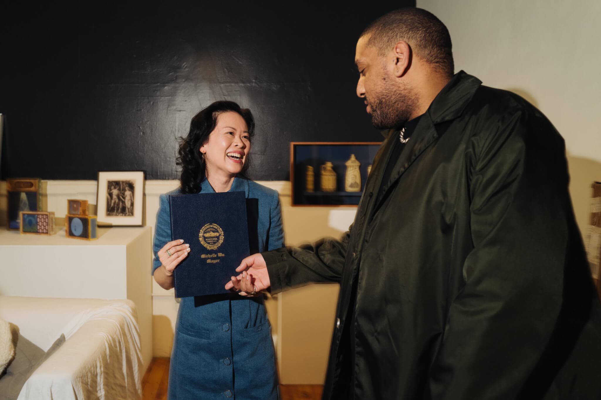 Joseph Zeal-Henry presented Yng-Ru Chen with a certificate of recognition from Mayor Michelle Wu. Photo by Vikram Valluri/BFA.com.