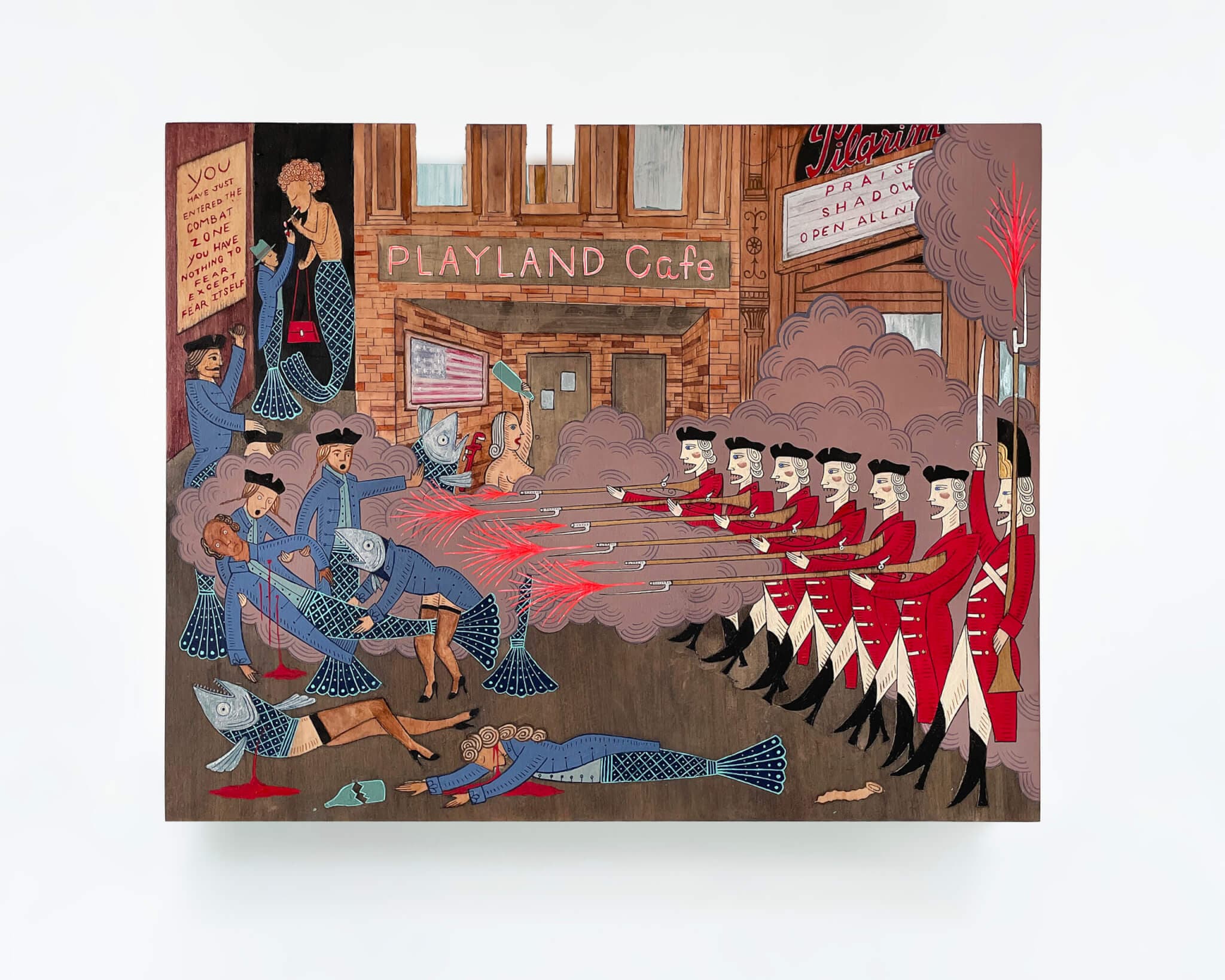 To mark the occasion through a new painting, Duke Riley drew on memories of Boston’s Combat Zone, a city-sanctioned red-light district near Chinatown that operated from the 1960s to the early 1990s. Pictured: Duke Riley, Praise Shadows, 2026. Gouache, ink, and wood stain on wood panel, blackened steel frame. 18 1/2 x 22 1/2 inches (including frame). Image courtesy the artist and Praise Shadows, Boston.