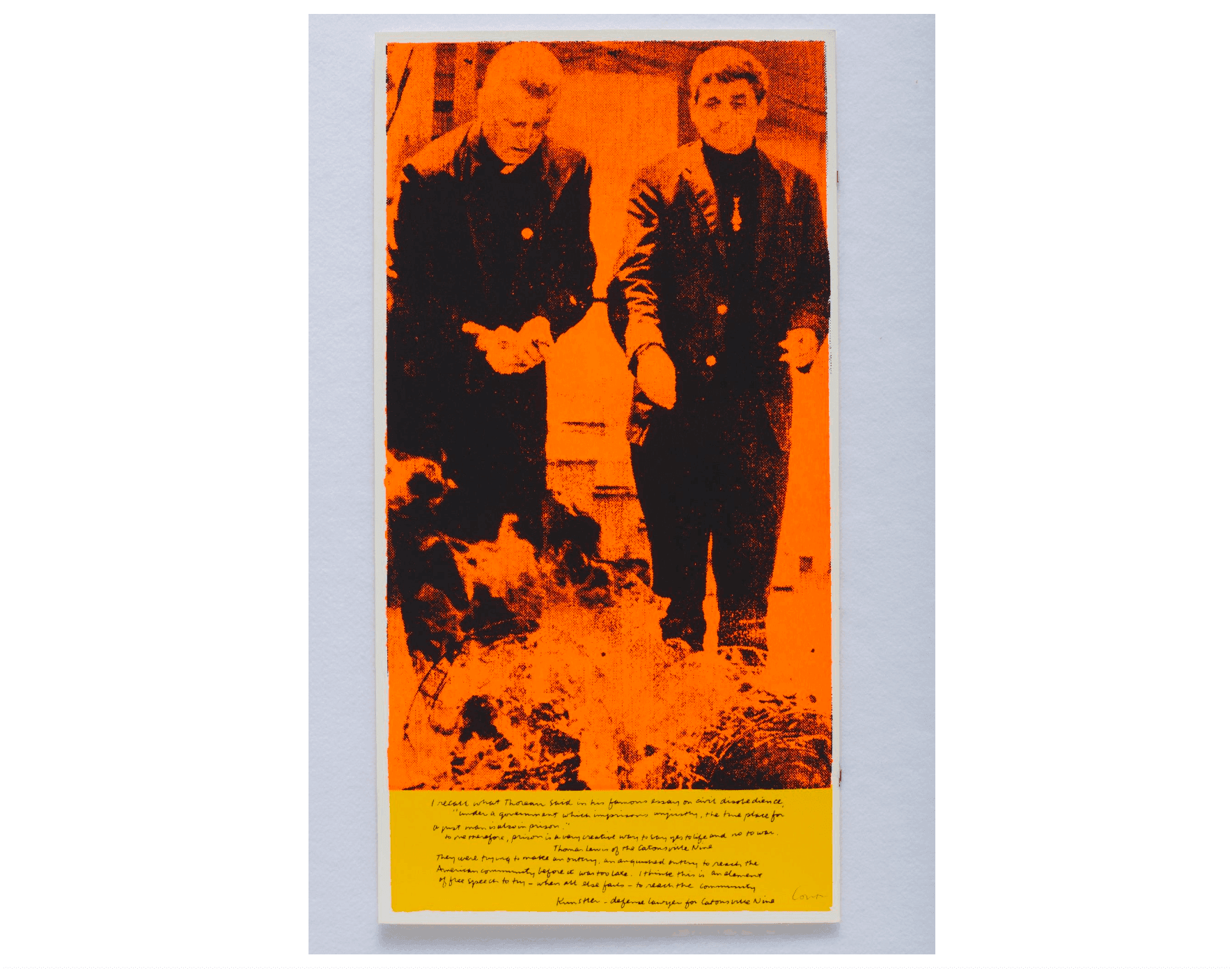 Forces of cultural life in LA at the time, Kent and the IHM sisters liberally interpreted the Vatican II Decree on the Adaptation and Renewal of Religious Life, which encouraged members of religious orders to adapt their practices to the needs of modern times. They supported Vietnam War dissenters and contributed signage for various humanitarian protests. The print phil and dan (1969) from Kent’s heroes and sheroes series reproduces a newspaper image of the Berrigan brothers, both priests, burning their draft cards (Philip Berrigan, the adjacent label notes, was a Holy Cross grad). The nuns bucked up against the conservative Cardinal McIntyre, who considered their liberal interpretation of the decree sacrilegious. This pressure from local ecclesiastic authorities led to the majority of the IHM sisters leaving the Church in 1970 and forming the Immaculate Heart Community.