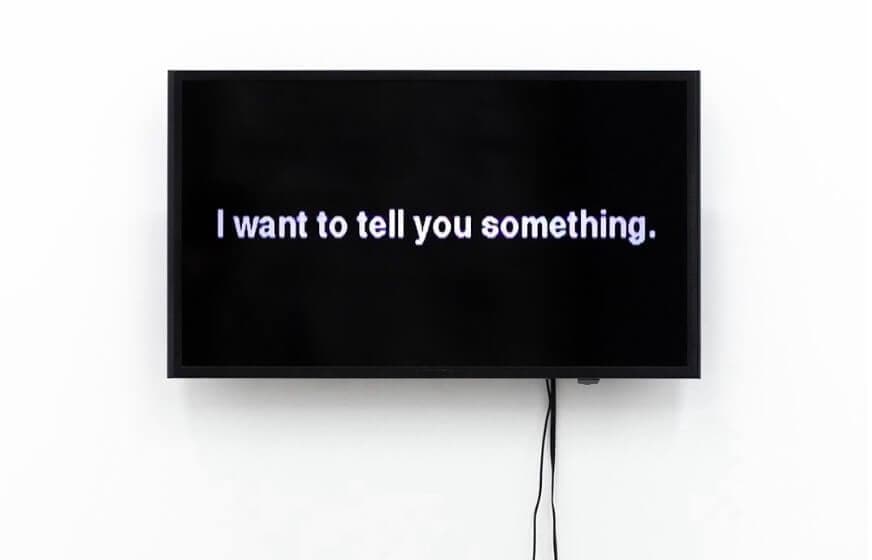 Installation view, Suara Welitoff, "I Want To Tell You." Continuously looping video. 2017.