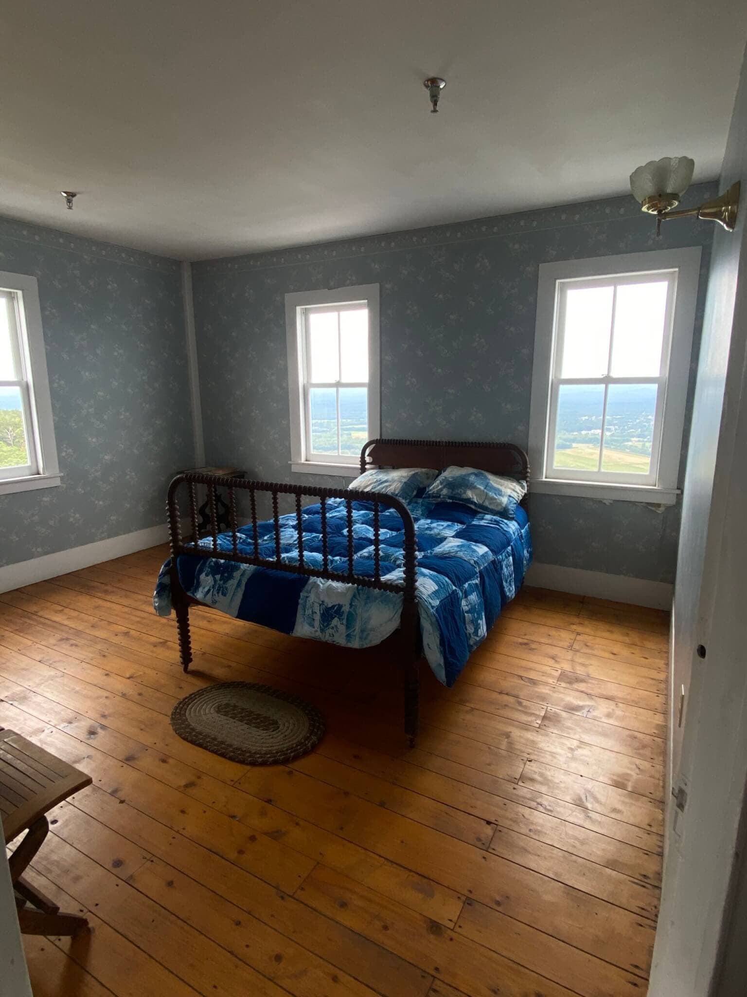 The exhibition continues in the Prospect House, a hotel built in 1851, and now a house museum. There, over a dozen works by “Summit Show” participants—including paintings, sculptures, textiles, and a looping video program in a second floor bathroom, “Dizzy TV Presents”—are sometimes confusingly interwoven with a permanent display of historical furnishings, ephemera, and reproductions of landscape paintings that capture the view (including a faded framed poster of the citational work by Cole).